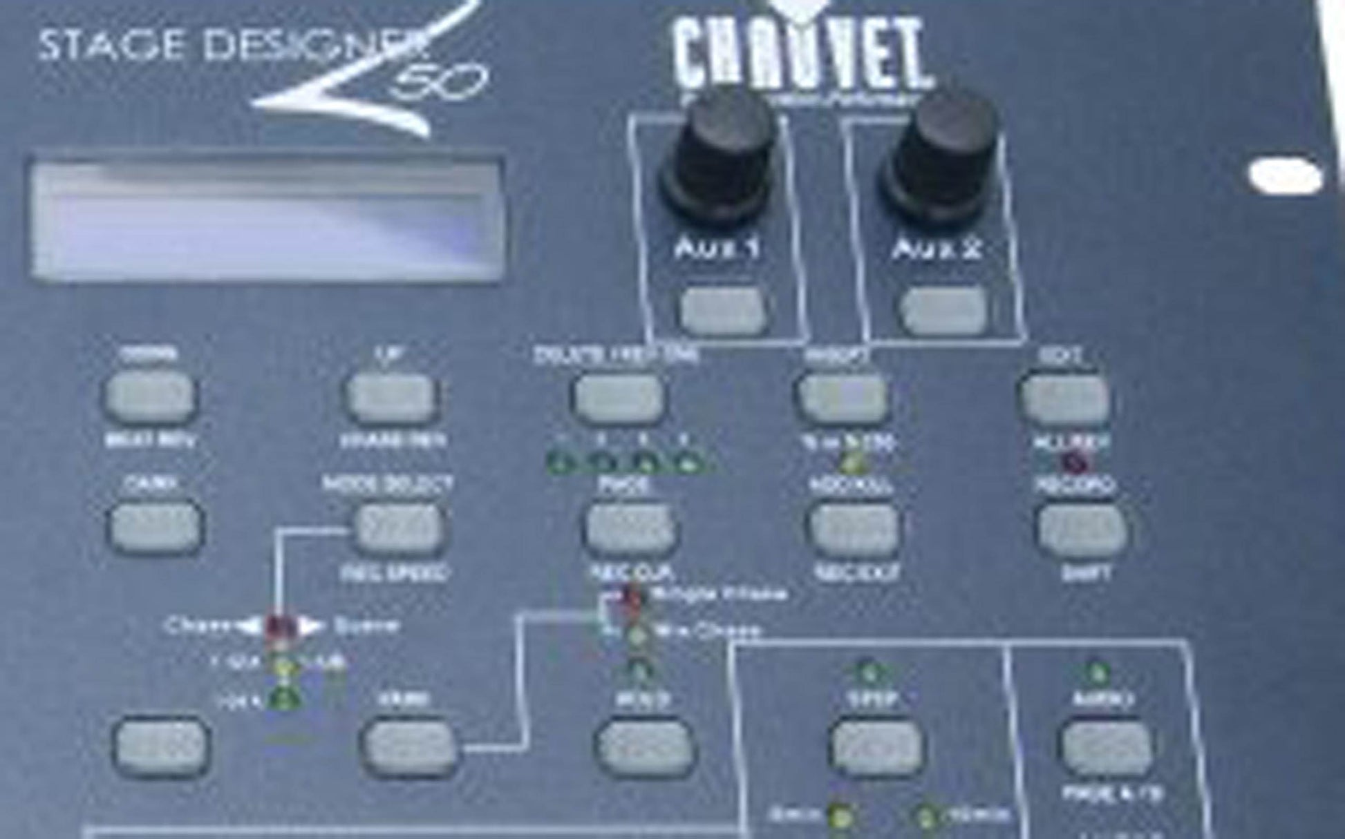 The **Chauvet Stage-Designer 50** takes the size of a 24-channel dimming console and the functionality of a 48- channel console and combines the two into one powerful dimming unit. The Stage Designer™ 50 has up to 8 pages with 12 scenes each and 96,000 programmable steps. The console allows the user to re-assign channels as needed and allows for MIDI input.