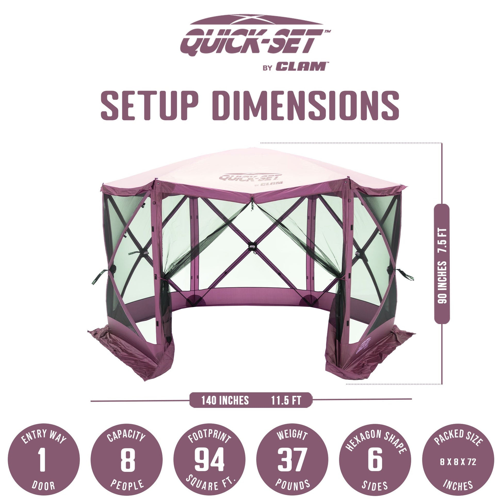 No assembly is required and it sets up in just about 45 seconds. When your stay is over, the Quick-Set Escape can be easily stored in its convenient oversized carry bag. The pop-up canopy packed size measures 8 inches long by 8 inches wide by 6 feet tall. Hub to hub, this tent measures 140 inches wide, 140 inches long, and measures 7.5-foot at center height. The set-up size measures 11.5 feet across the inside.
