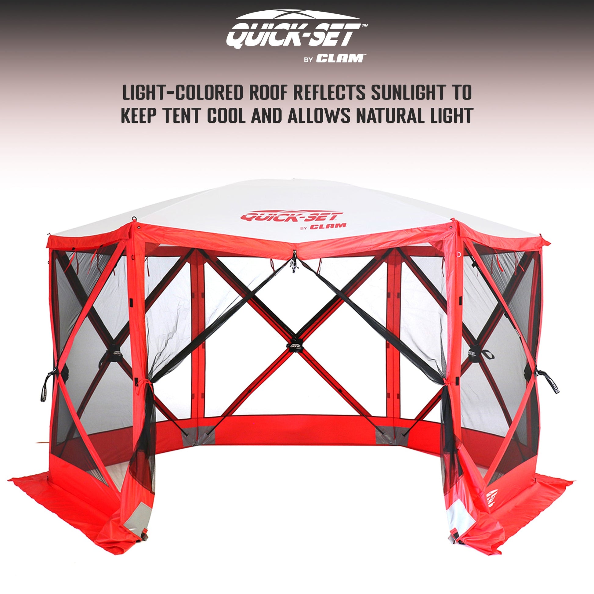 Equipped with a pop-up design, this gazebo tent only takes 45 seconds and 1 person to set up at a tailgate sporting event, corporate event, or even farmer's market. No assembly is required. When your stay is over, the Quick-Set Escape can be easily stored in its convenient oversized carry bag. Hub to hub, this tent measures 140 inches wide, 140 inches long, and measures 7.5-foot at center height. Set-up size measures 11.5-foot across. Featuring extra-large, flex-tested 11mm fiberglass poles and reinforced corner pole pockets, this pop-up gazebo will provide stability and storage space when out in the wilderness.