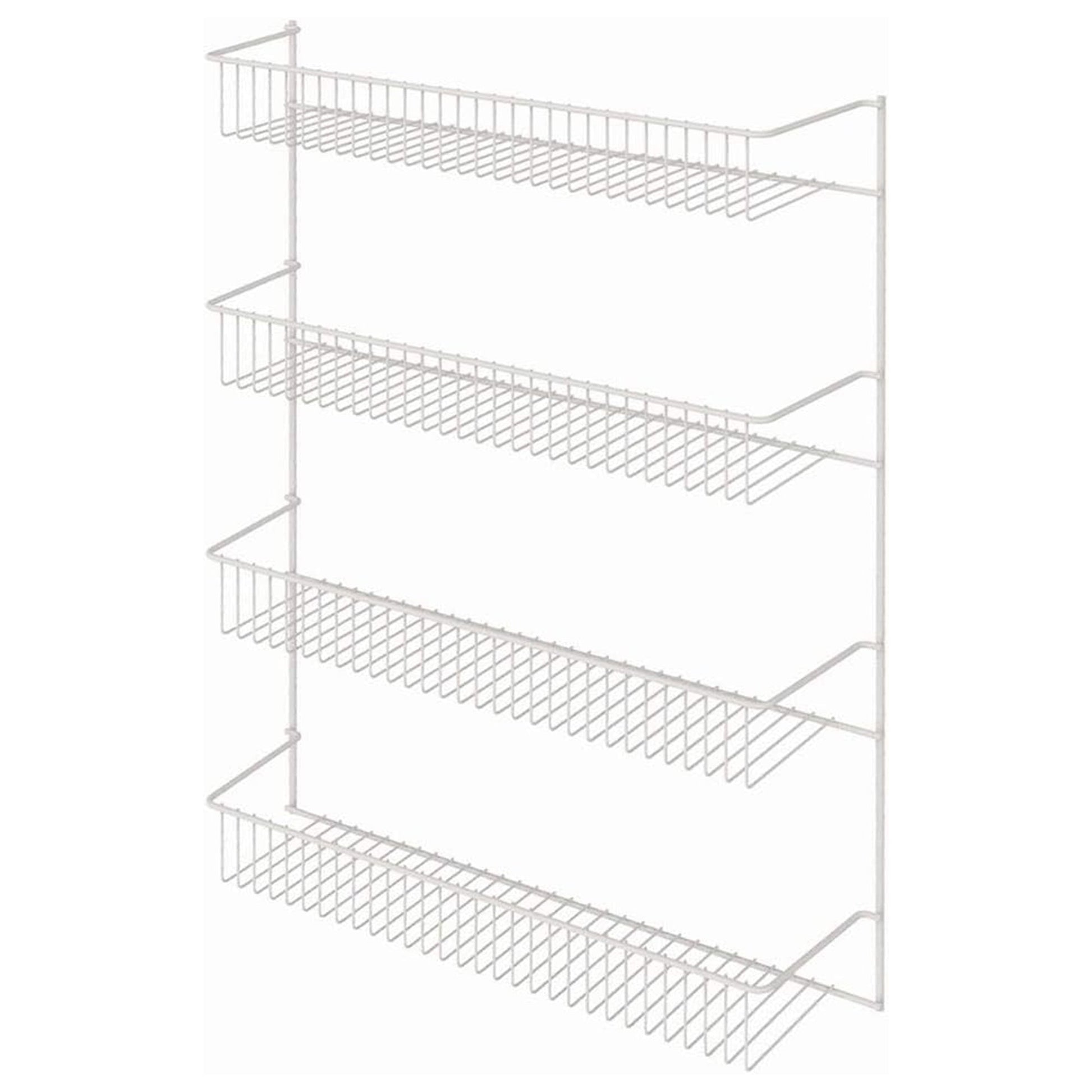 - Rack organizer with door or wall mount and 4 tiers for eliminating clutter and storing kitchen, pantry, or cleaning supplies