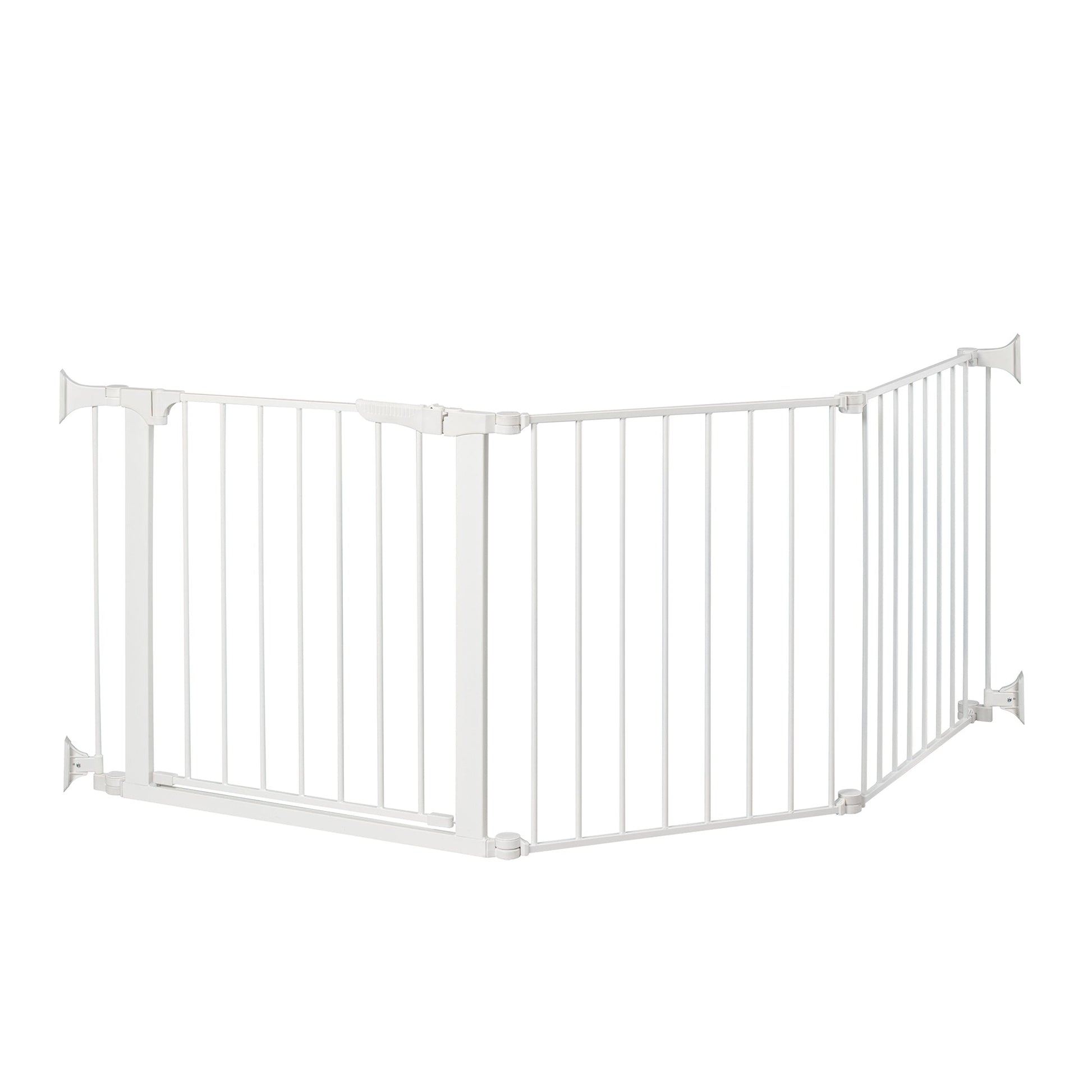 The gate measures 84-inches inches wide when installed in a straight line. Optional 24-inch extensions (sold separately) can be paired to make the gate longer. Installing quickly with instructions, the system withstands regular use with a durable steel frame and a safe, non-toxic powder-coat finish.