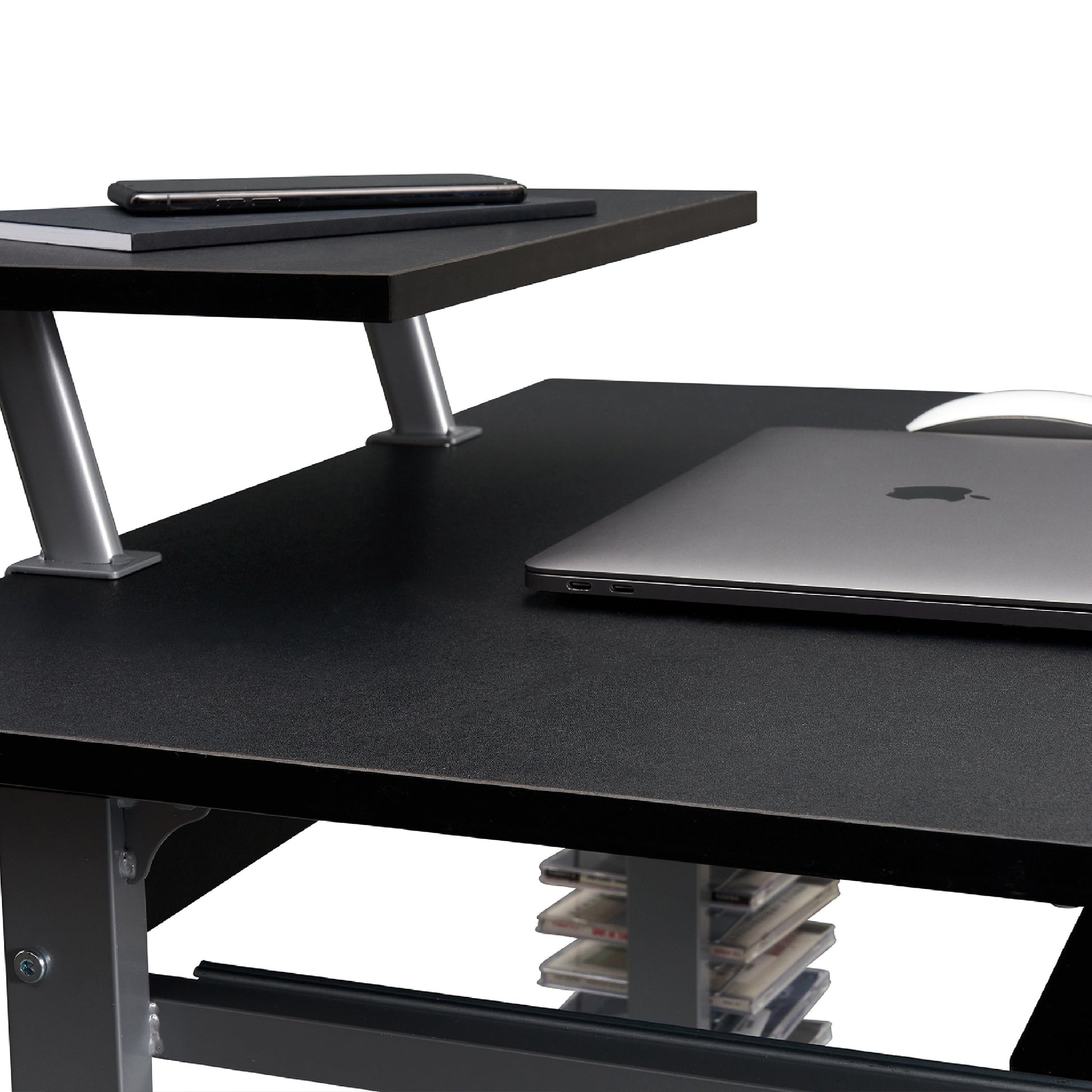 LONG DESCRIPTION : This Techni Mobili Compact Computer Cart is made with heavy-duty engineered wood panels with a moisture resistant PVC laminate veneer and a scratch-resistant powder-coated steel frame. The adjustable shelf can be mounted center, right or left of desktop. It also features a slide-out keyboard shelf equipped with a safety stop, side media rack for CDs or DVDs, bottom accessory shelf, large bottom shelf to accommodate a CPU and accessories, and large double-wheel non-marking locking casters. The desktop has a 100lb weight capacity, the shelves each have a 30lb weight capacity, and the keyboard shelf can hold up to 20lbs. Color: Graphite