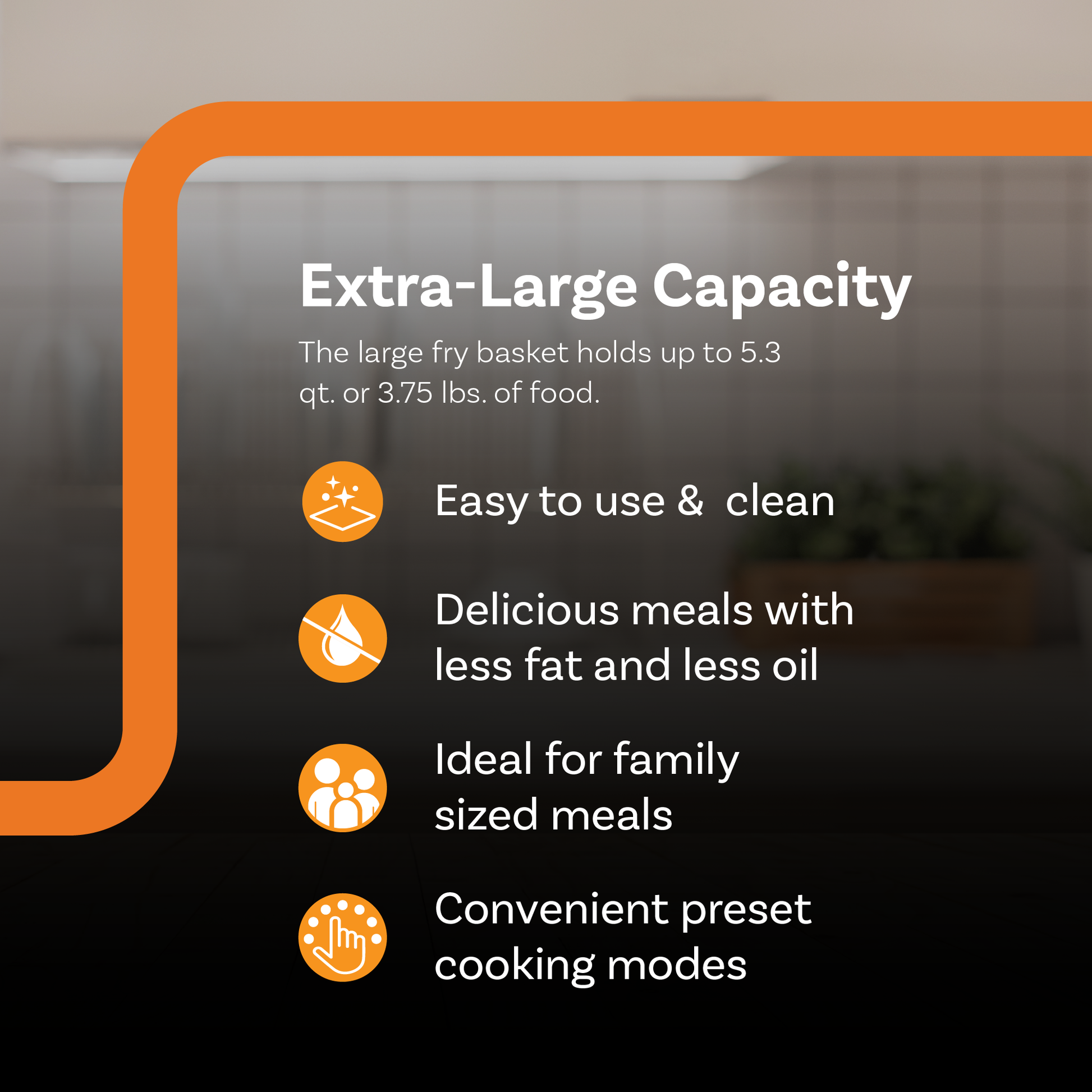 This fryer is designed with a high-power convection fan to ensure even cooking from 180°–400°. It includes a cool-touch handle for extra-safe cooking and serving. The exterior is easy to clean, and the nonstick pan and rack are dishwasher safe for hassle-free cleanup after each meal.