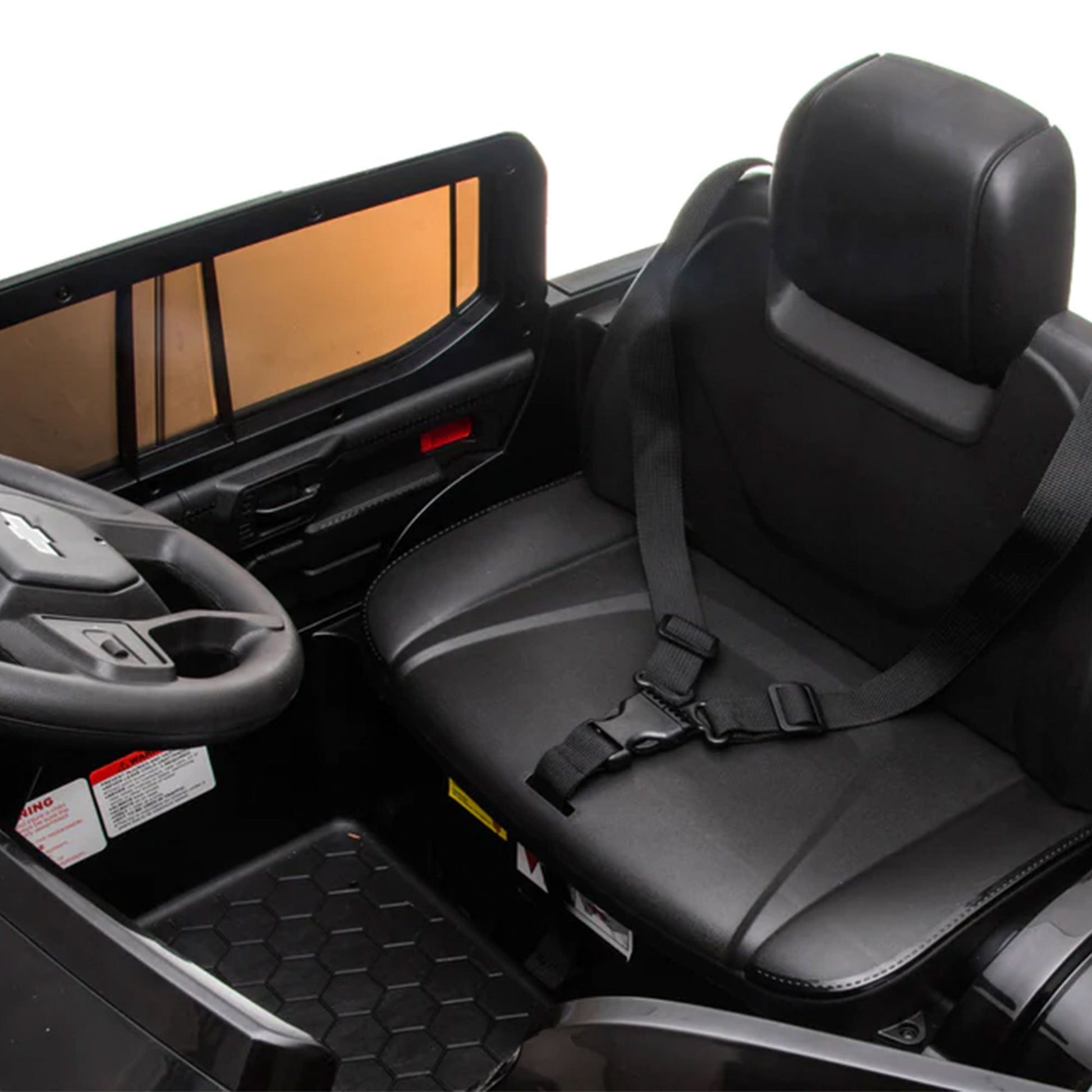 - Features (1) seat with belts and (2) openable doors with safety locks for child security