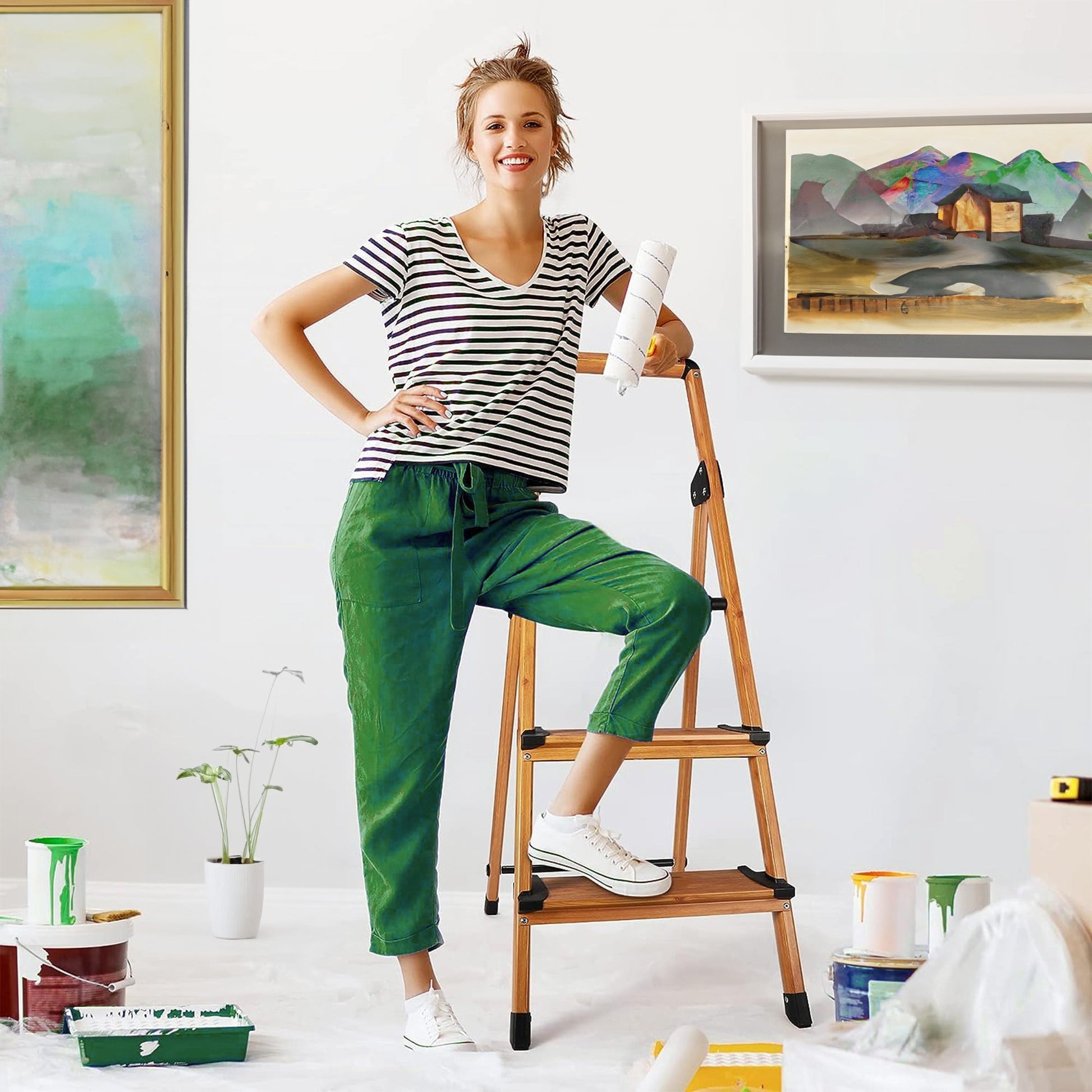 Crafted with sturdy aluminum, this stepladder can support up to 330 pounds, ensuring your safety and stability. The large resistant to slip platform and anti-skid rubber feet allow you to set both feet firmly in place while providing heel-to-toe foot support and avoiding floor scratches. With a snap-on safety latch, you can have full confidence when stepping on and off of this step-stool as the metal buckle locks automatically in place when the ladder is fully unfolded. Whether you're in the kitchen, bathroom, office, or garage, this woodgrain-style ladder is your versatile solution for home renovation projects, decorating your house, or just reaching where you need.