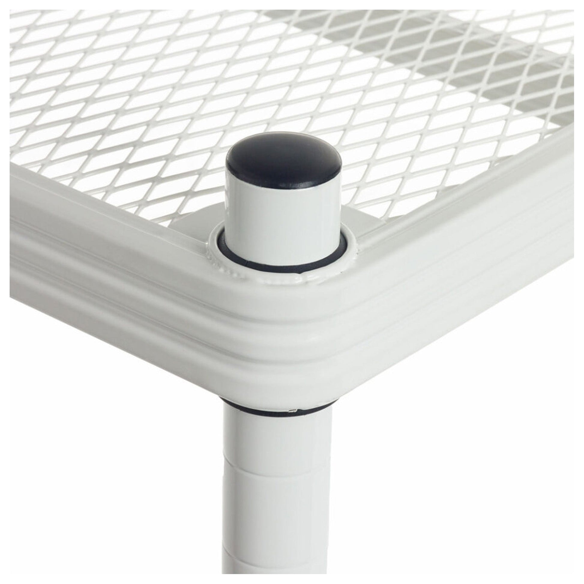 Featuring a heavy-duty steel metal mesh design and epoxy coating, each shelf from this standing shelf unit is capable of holding up to 440 pounds. With the expanded metal mesh shelving, this multipurpose display shelf rack will not let bottles, cans, or other small items fall through. This shelving rack for pantry storage gives you the ability to customize your space as you can add either caster wheels (sold separately) or another shelf (sold separately) giving you your own unique storage freedom.