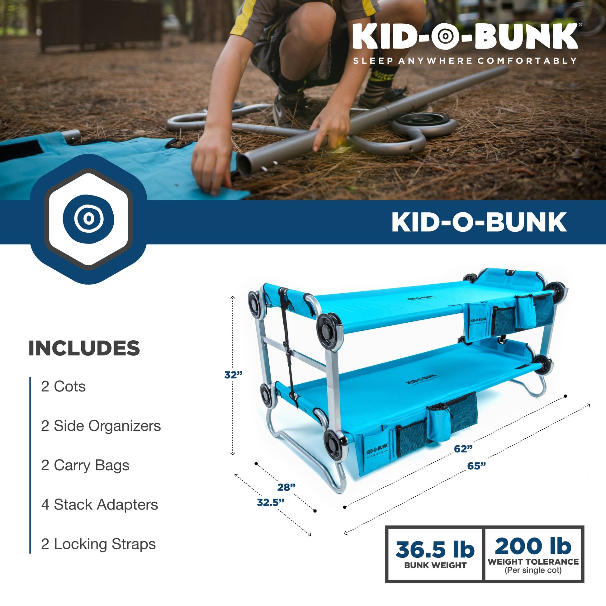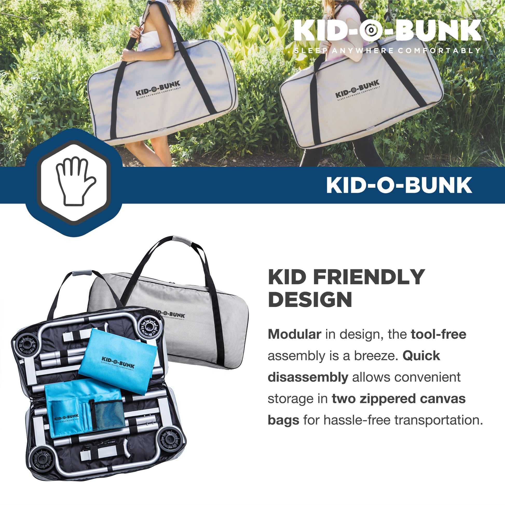 Unlock a world of comfort and convenience for your children with the Kid-O-Bunk. This versatile set includes 2 Kid-O-Bunk cots, 4 stack adapters, 2 FREE carry bags, and 2 locking straps, providing everything you need for a great night's sleep.