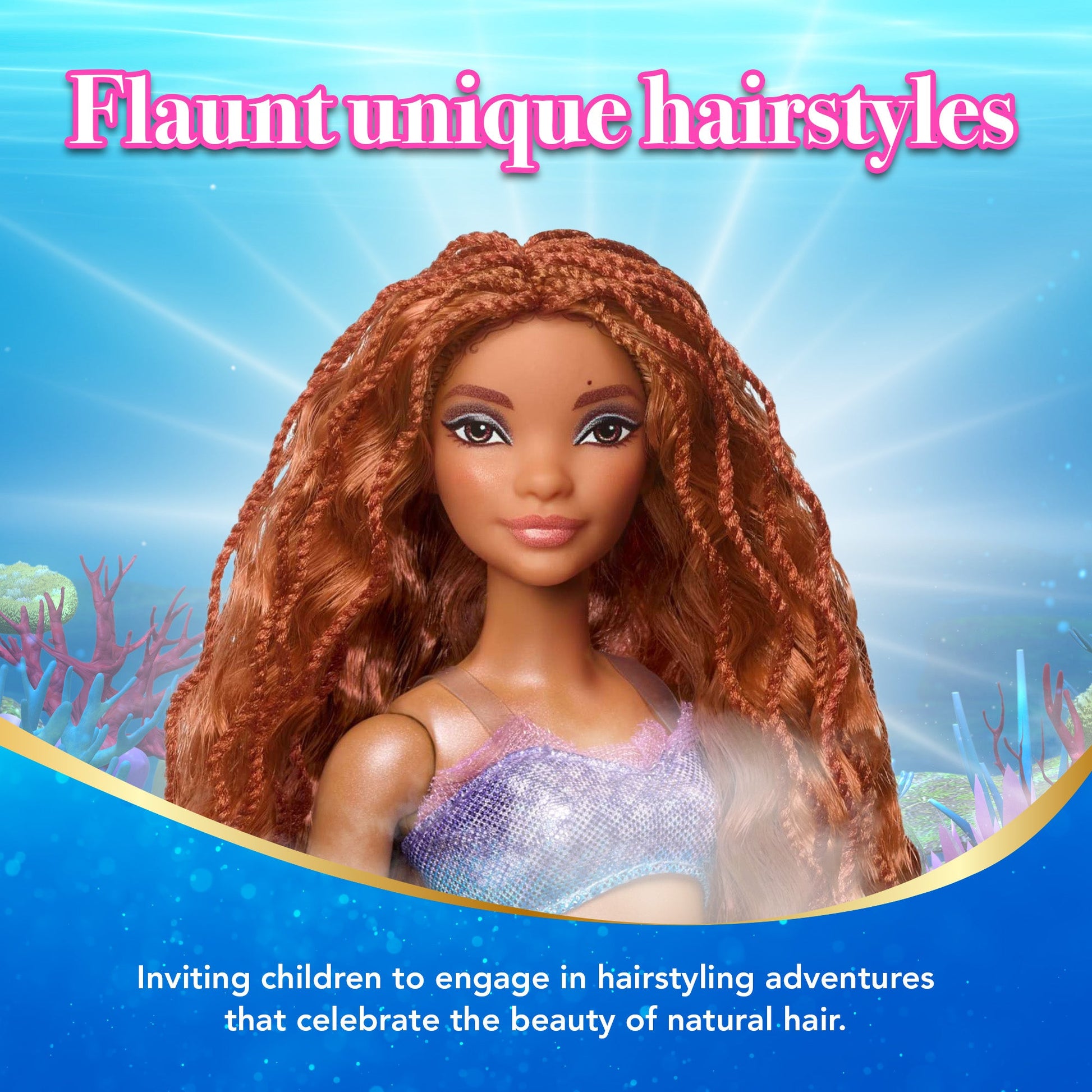 Hair becomes a canvas for creativity as each sister showcases her own unique hairstyle, inviting children to engage in styling adventures that celebrate the beauty of natural hair. Ariel's long, flowing red locks set the stage for imaginative play, encouraging kids to recreate their favorite scenes from The Little Mermaid or weave new tales of aquatic exploration and sisterly camaraderie.