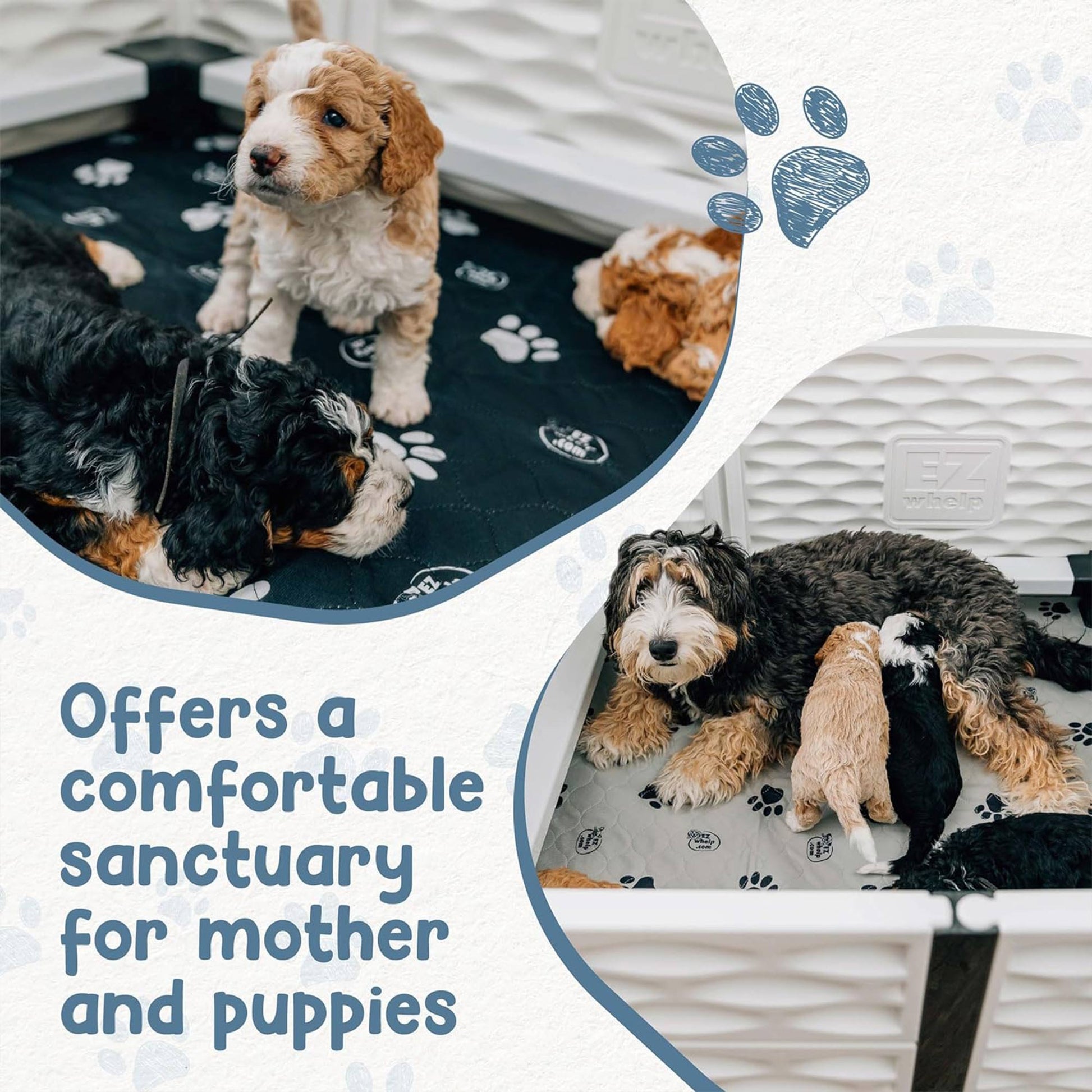This puppy essential comes with a removable rail assembly that protects puppies from being smothered by their mother and has a front panel with a 3-piece door that eliminates puppies from escaping. The 3-piece door allows you easy access to the puppies. This entrance allows the mother to come and go without feeling trapped. The durable box has a portable design, allowing you to easily move it from room to room. The dog cage requires no tools to assemble, so setup is quick and easy. This dog whelping box has a soft, absorbent machine-washable canvas lining and a reusable pet pee pad. To clean the gate, simply wash it using detergents or bleach. More than just a birthing box for dogs, the EZclassic can also be used as a pet playpen indoor dog enclosure, or dog pen.