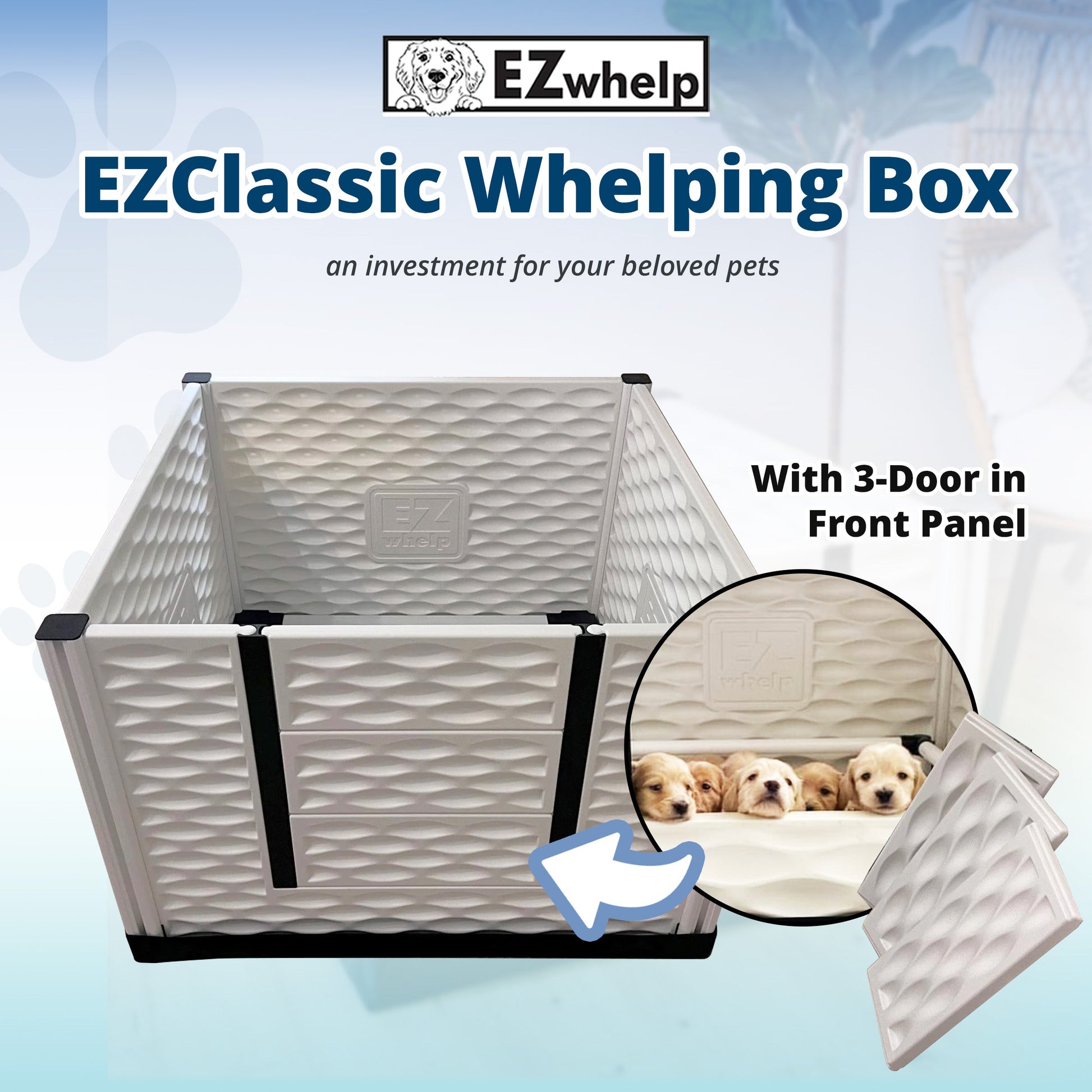 - Upgrade your pet care with the EZclassic Tall Whelping Box, constructed with durable yet lightweight injection molded plastic with removable rail assembly to increase litter safety