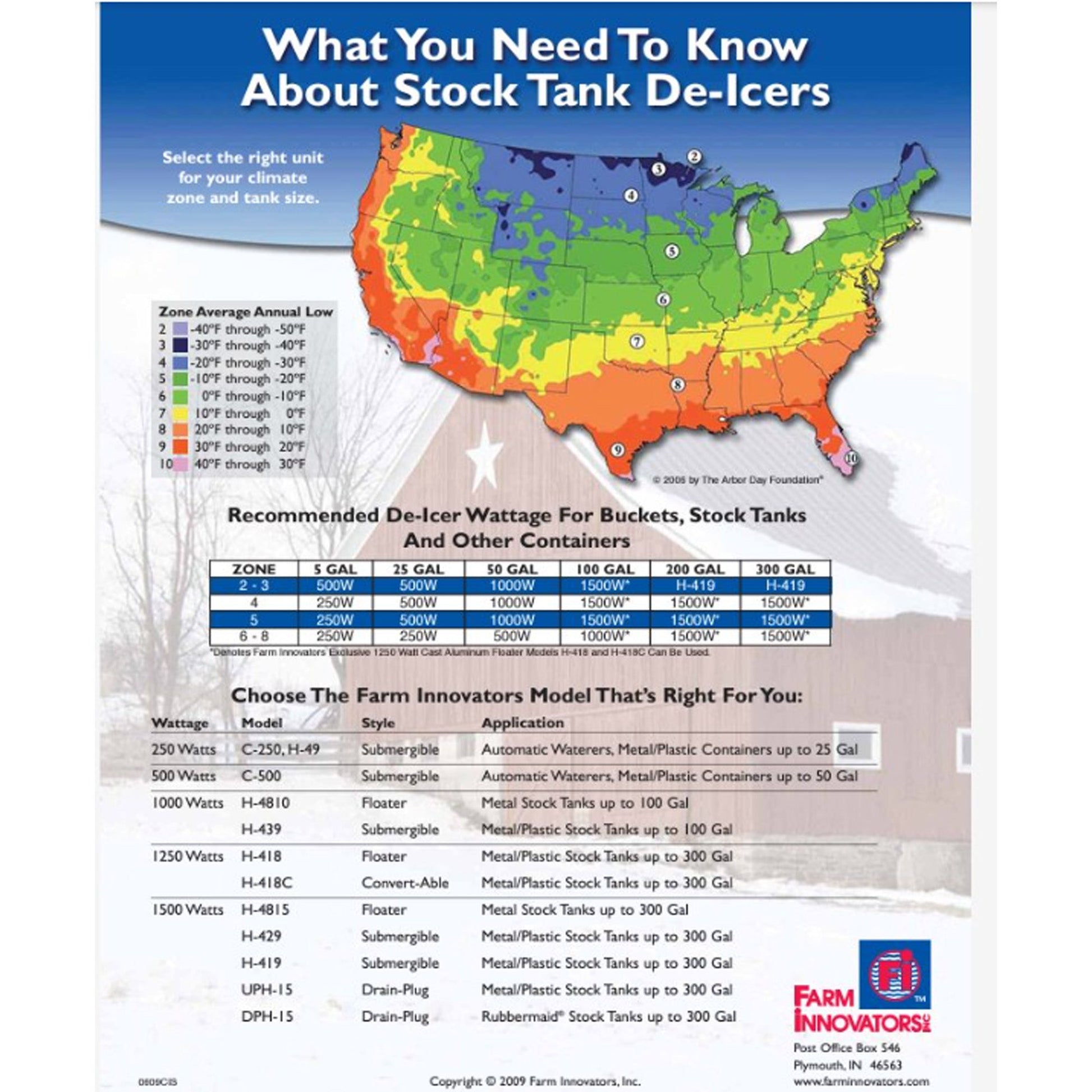 - De-icer submerges beneath the water in your livestock tanks around the farm and home