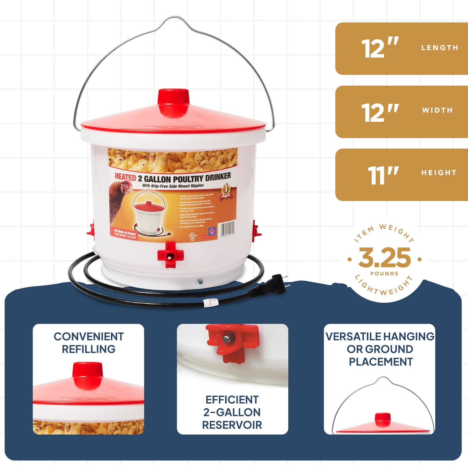 - Set of (3) heated water drinkers that prevent water from freezing in subzero temperatures so your chicken can have clean water year-round