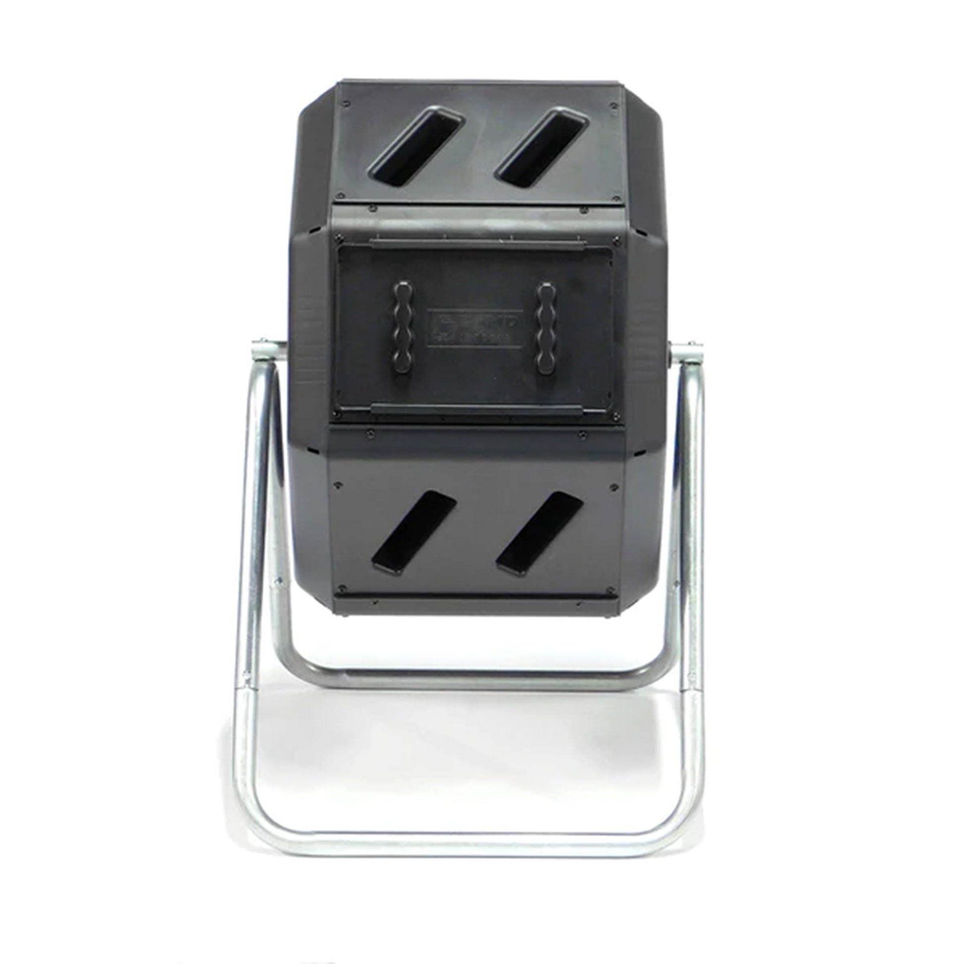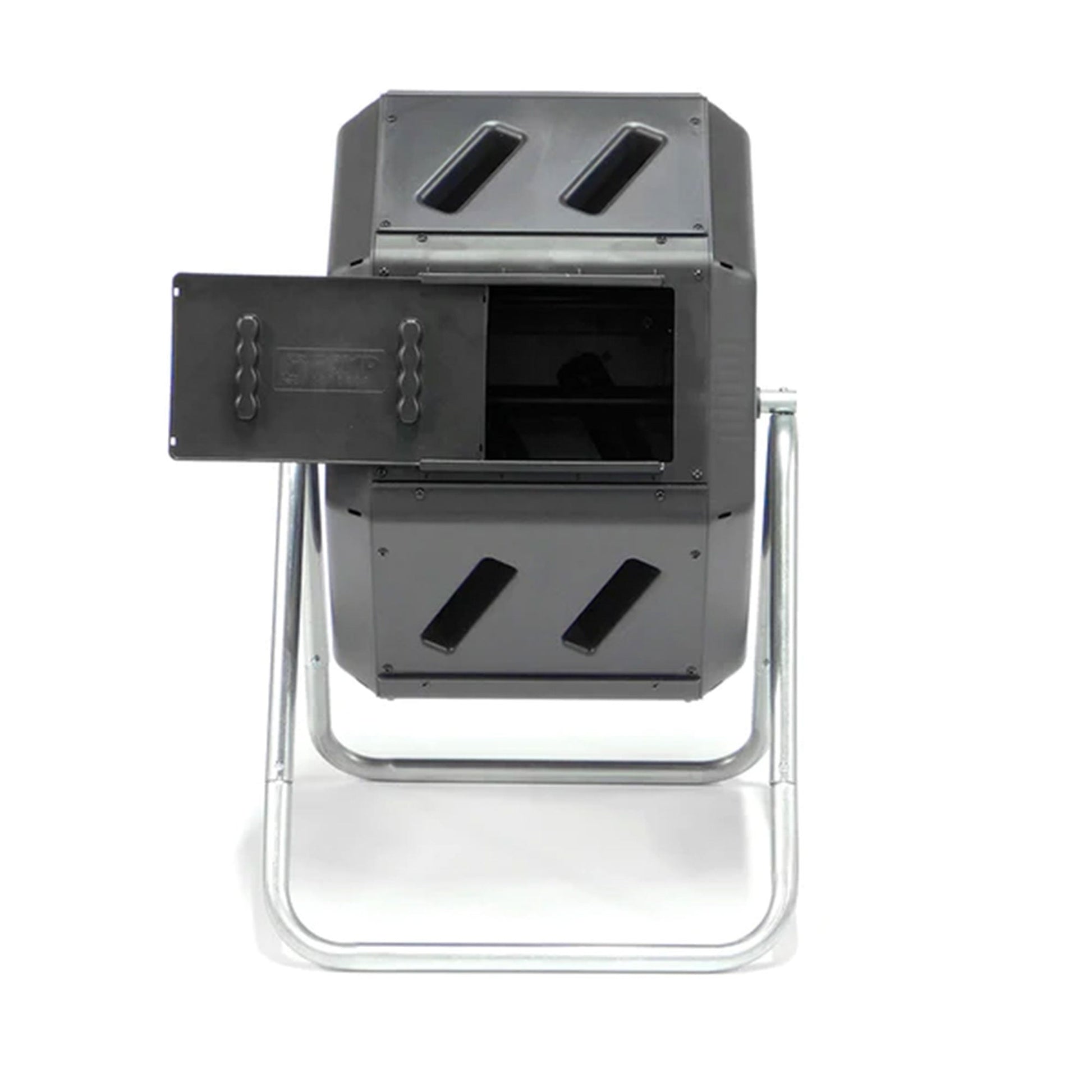 Fantastic for beginners, the large openings and removable door make it easy to toss in clipping and remove compost. The deep fins on the body provide ergonomic handholds so you can roll the compost around easily. This composter is constructed from recycled, Ultra Violet-inhibited, and BPA-free polyethylene plastic with a galvanized steel frame for reliable use.