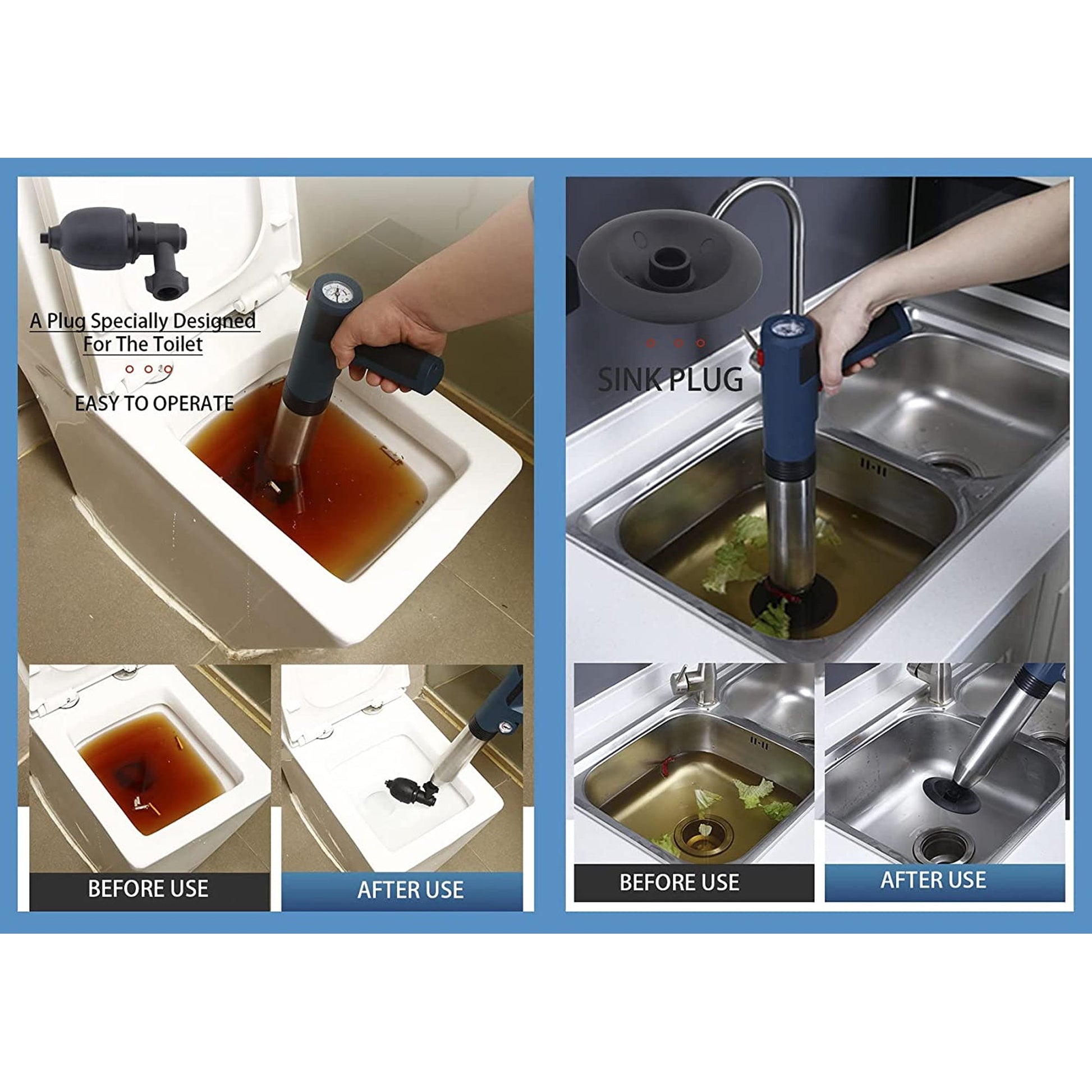- Easy to operate with 1-click charging and 1-click release of pressure while requiring less physical energy than plungers or snakes