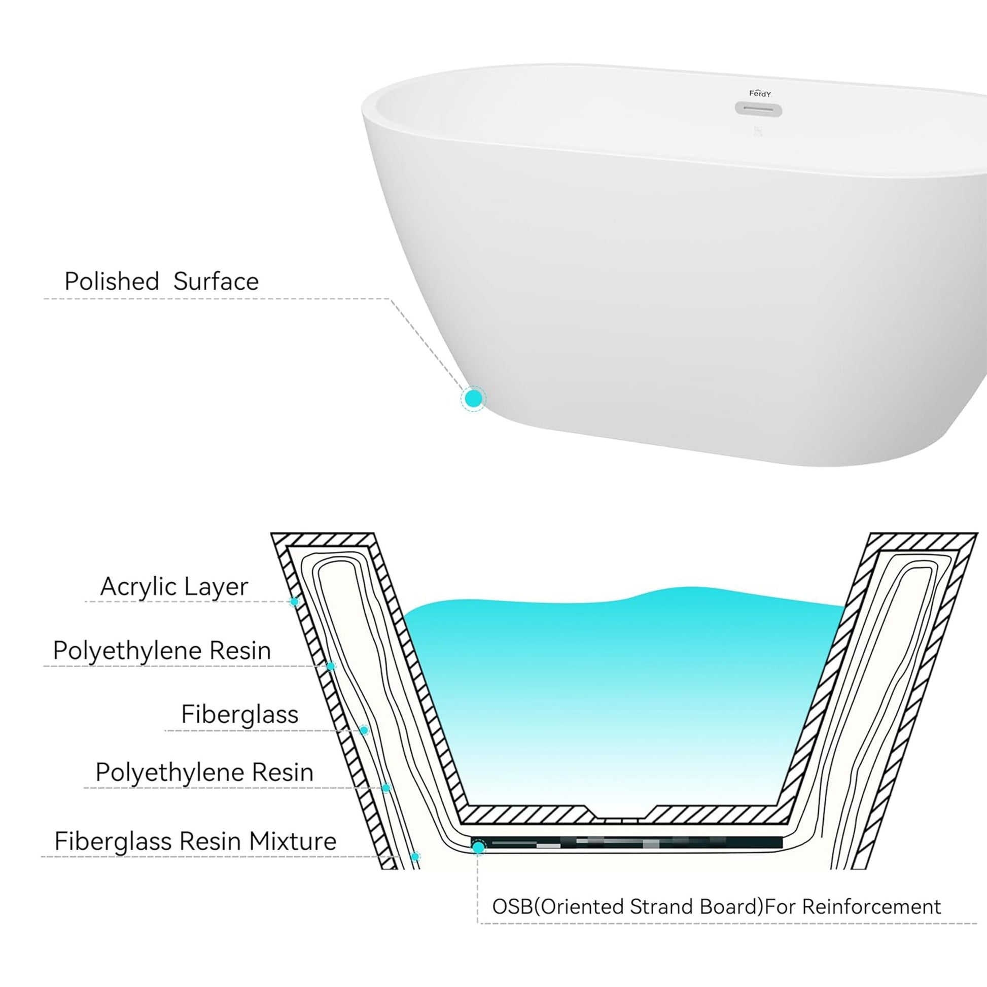 FerdY Bali 55 In Glossy Acrylic Freestanding Bathtub with Polished Chrome Drain