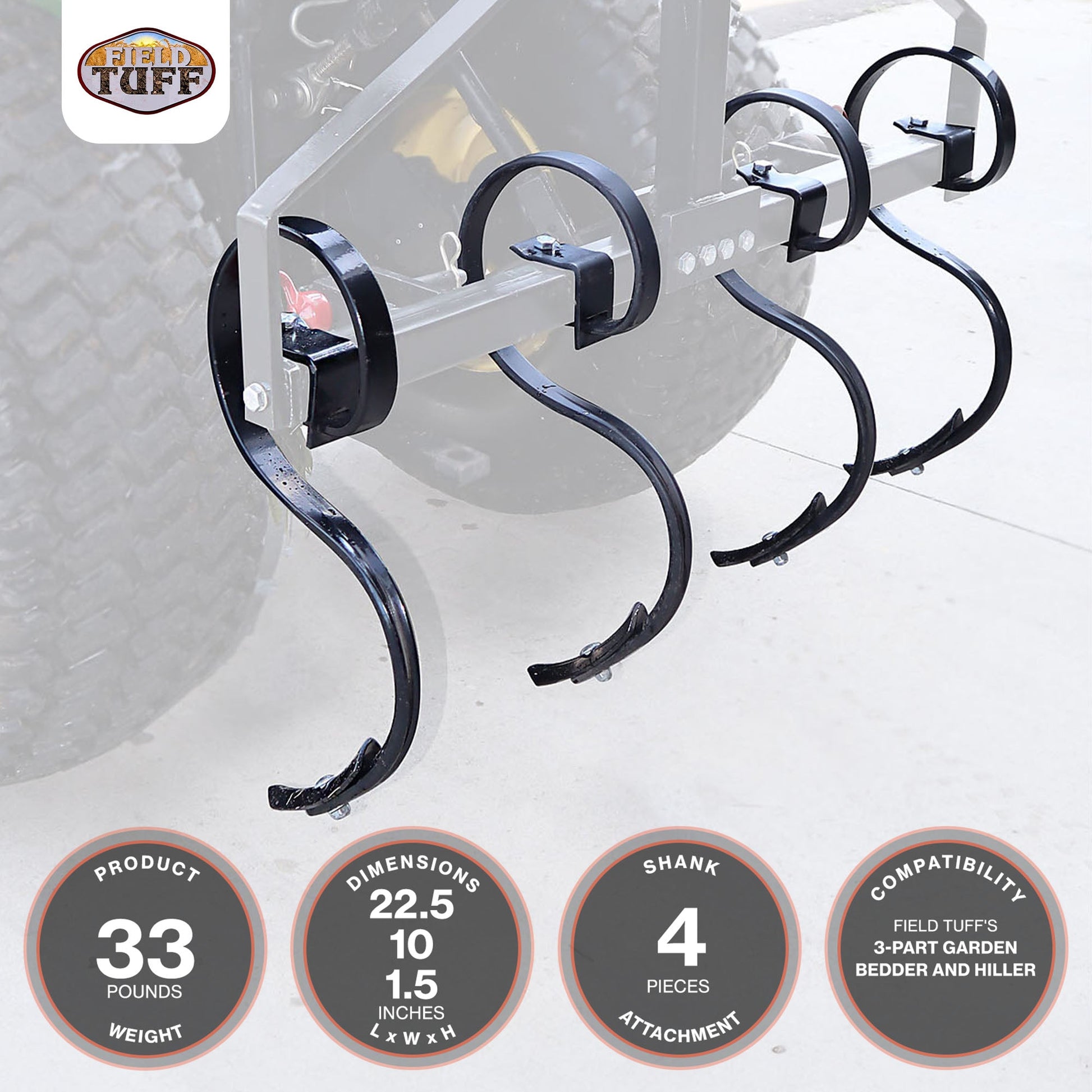 This attachment includes 4 S-tines with shovels and included mounting brackets, making installation and setup a cinch. Each tine measures 22.5 inches long by 10 inches wide by 1.5 inches high. Easily build your raised garden bed and sow the seeds of tomorrow with the Field Tuff Garden Bedder Hiller 4-Piece Shank Attachment
