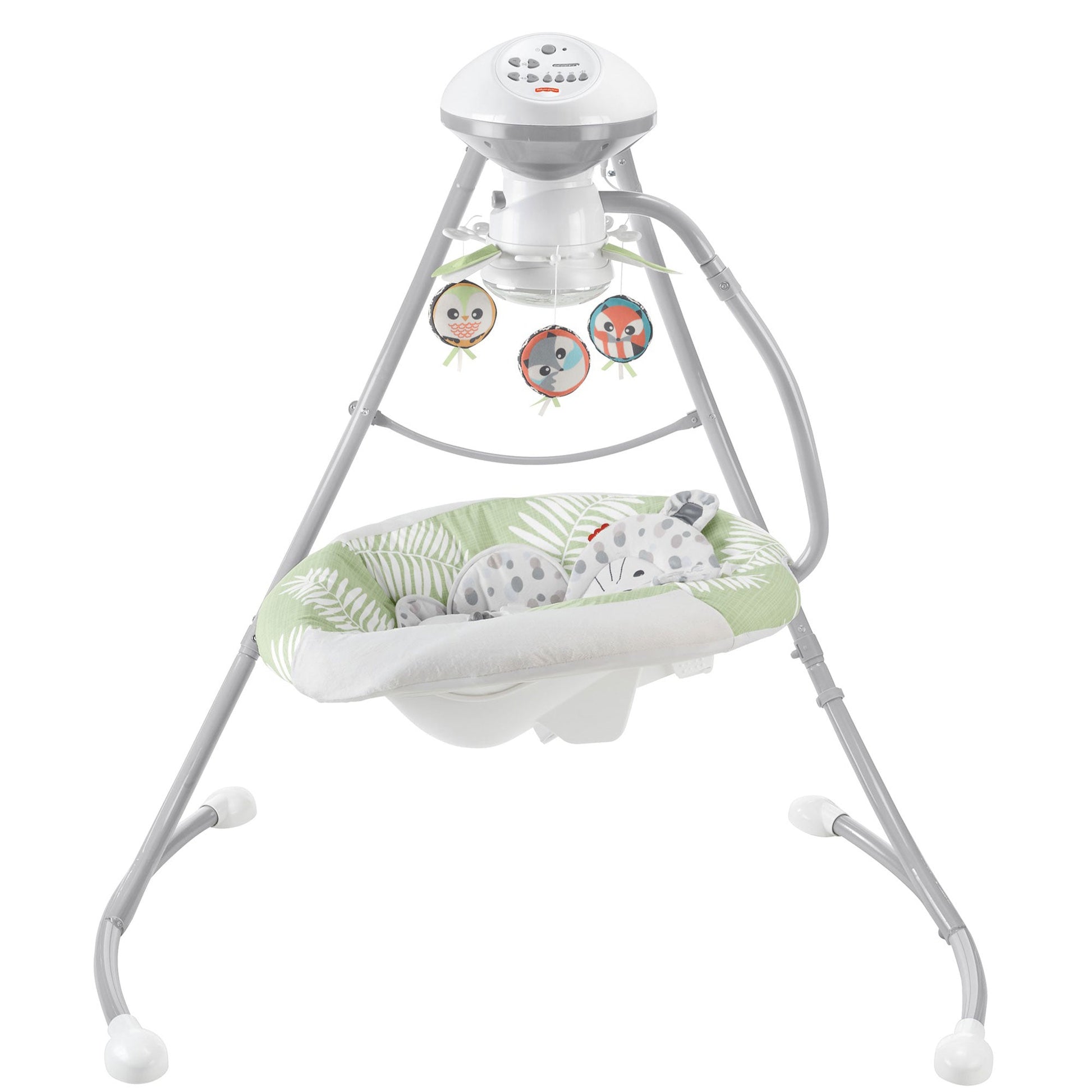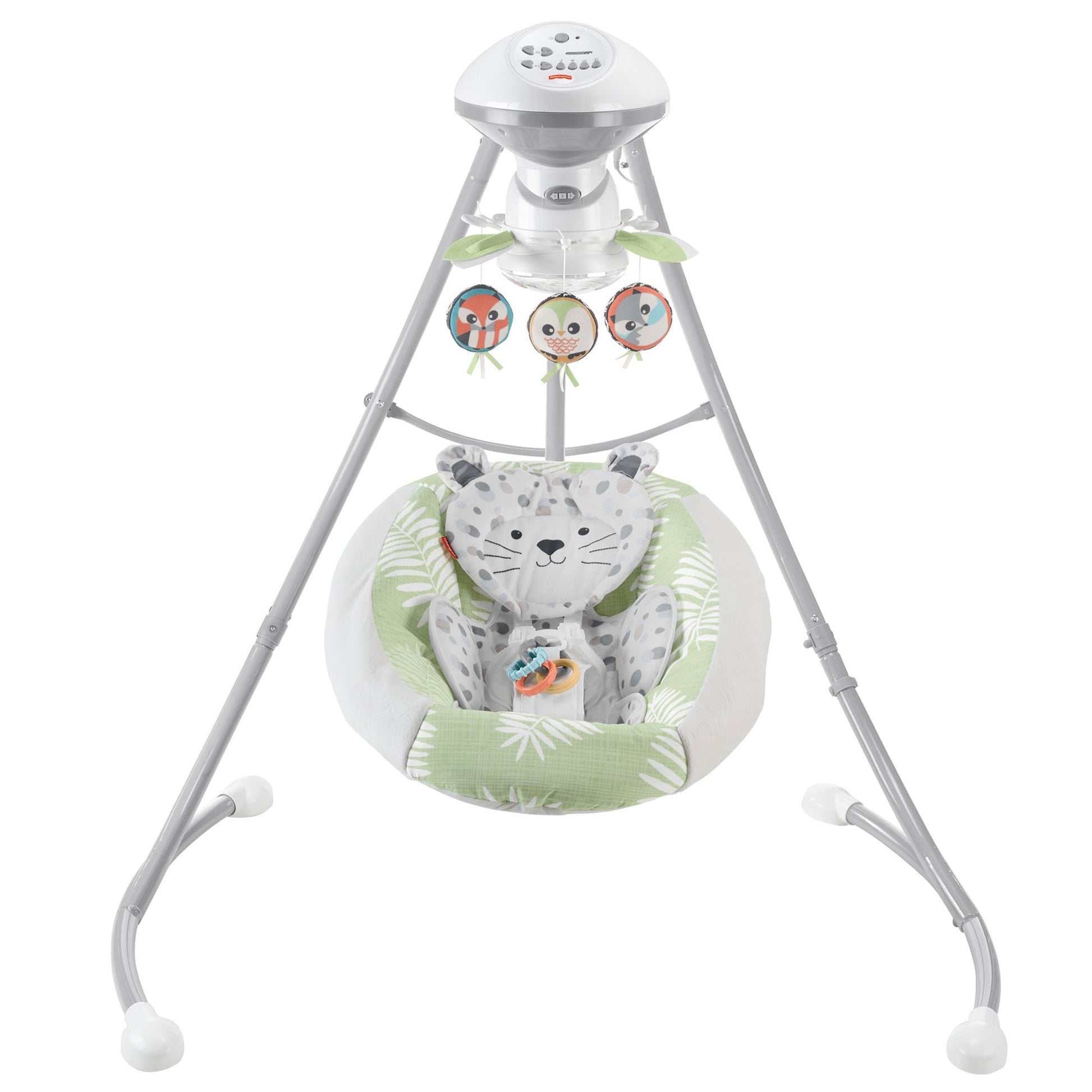 The snow leopard seat pad is removable and machine-washable for easy cleaning, and the legs fold for convenient storage. Make sure your baby feels comforted, supported, and cozy as they rest with the Dual Motion Swing from Fisher-Price.