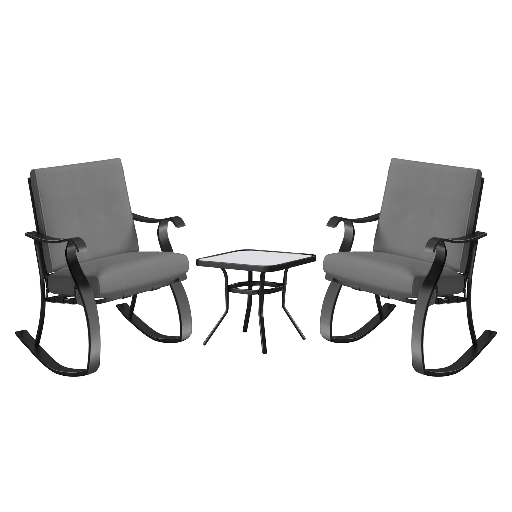 - Rocking bistro set featuring 3 pieces with a sleek charcoal gray finish to transform your outdoor space into a stylish retreat with a modern touch