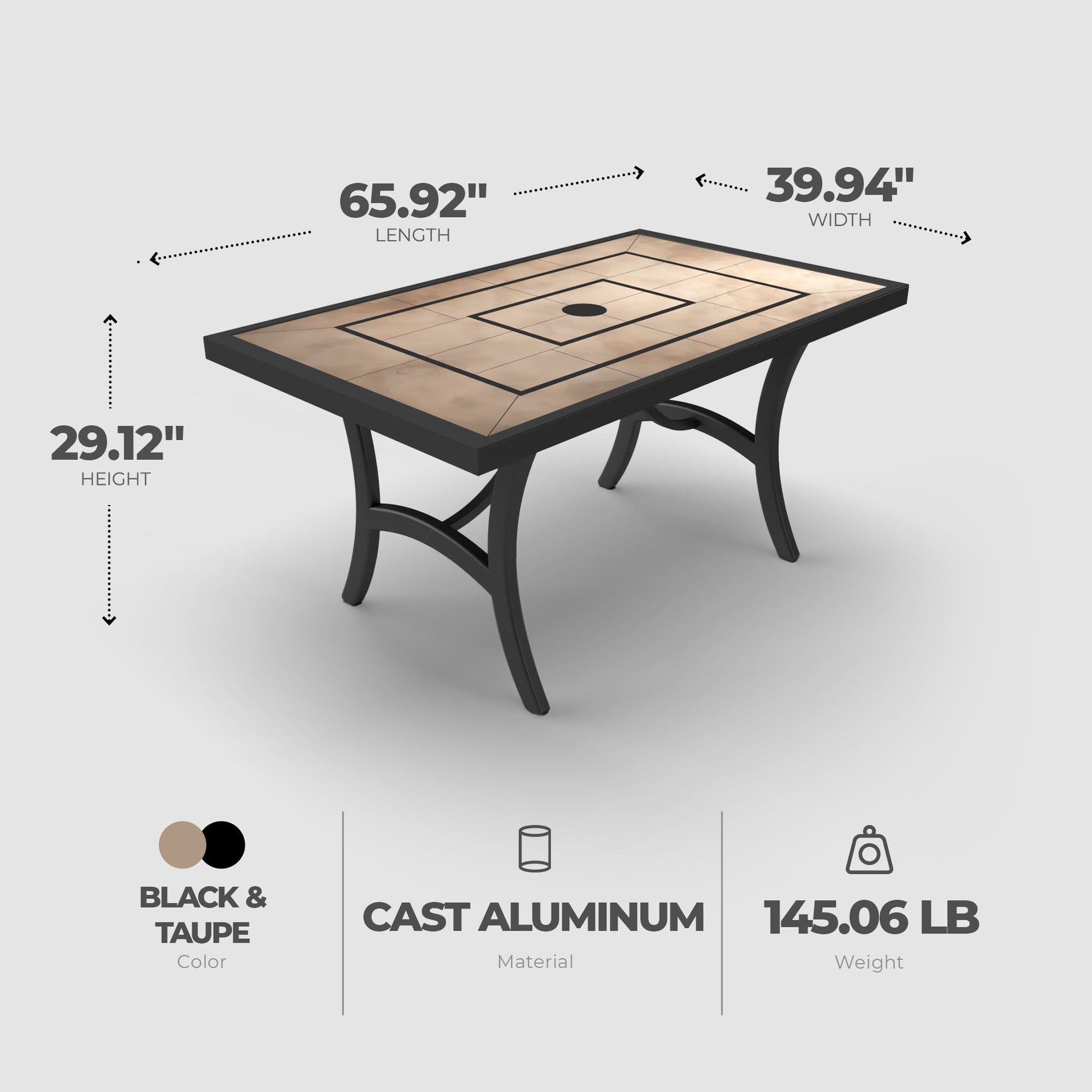 Immerse yourself in the artistry of handcrafted excellence, featuring cast aluminum dark frames adorned with grouted wood-look tiles and earthy-toned metal accents. The captivating design seamlessly combines form and function, creating a visual feast for your senses. The captured tile detail adds a touch of rustic charm, while the robust cast aluminum construction ensures longevity and resilience. With a weight capacity of 225 pounds, this dining table provides a sturdy foundation for delightful gatherings under the open sky. Complete the ensemble with the matching dining chair, swivel rocker, umbrella, and base (sold separately) to transform your outdoor space into a haven of style and comfort. The meticulous attention to detail is evident in the dimensions, with an assembled length of 65.92 inches, a width of 39.94 inches, and a height of 29.12 inches.