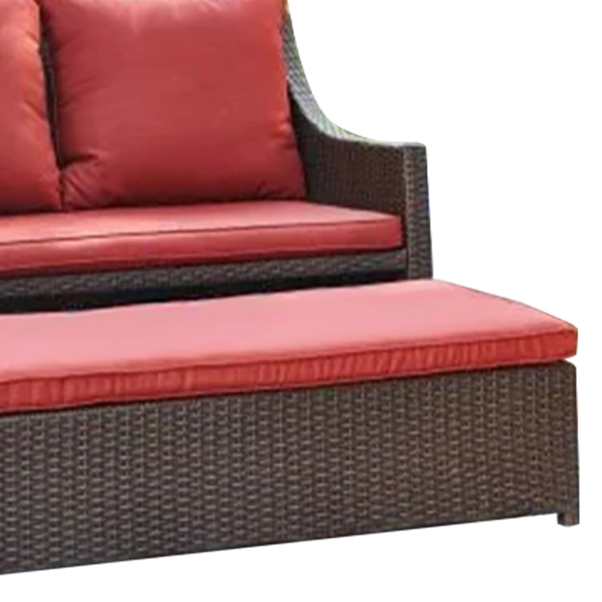 Fortified by a dark coffee powder-coated finish, the sturdy steel frame guarantees durability while exuding timeless allure. Indulge in the plush comfort provided by the red olefin cushions and pillow backs, designed for easy maintenance and lasting relaxation. Assembling your outside furniture is a breeze, and the design ensures this set remains resilient in the face of changing weather. The loveseat, measuring 31.89 inches long, 50.39 inches wide, and 33.46 inches tall, takes center stage alongside the thoughtfully designed ottoman and the versatile side table. Ingeniously, the ottoman stores under the loveseat, optimizing space and convenience whether you're using this for a large outdoor space, as balcony furniture, or a front porch furniture set.