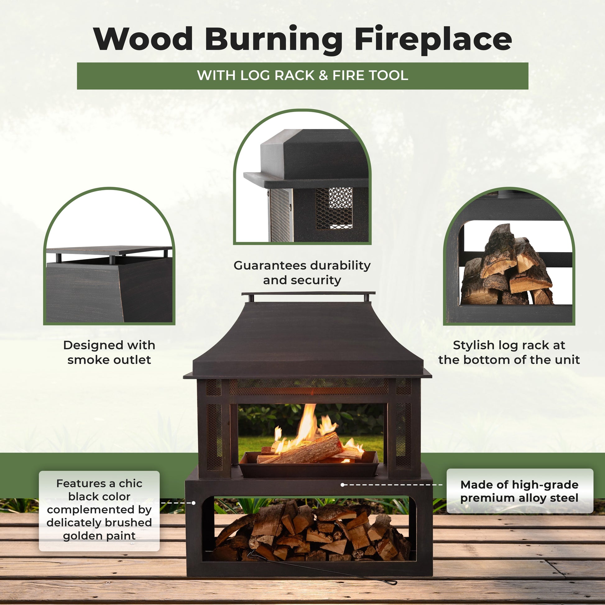 Four Seasons Courtyard Wood Burning Fireplace with Log Rack and Tool, Black/Gold