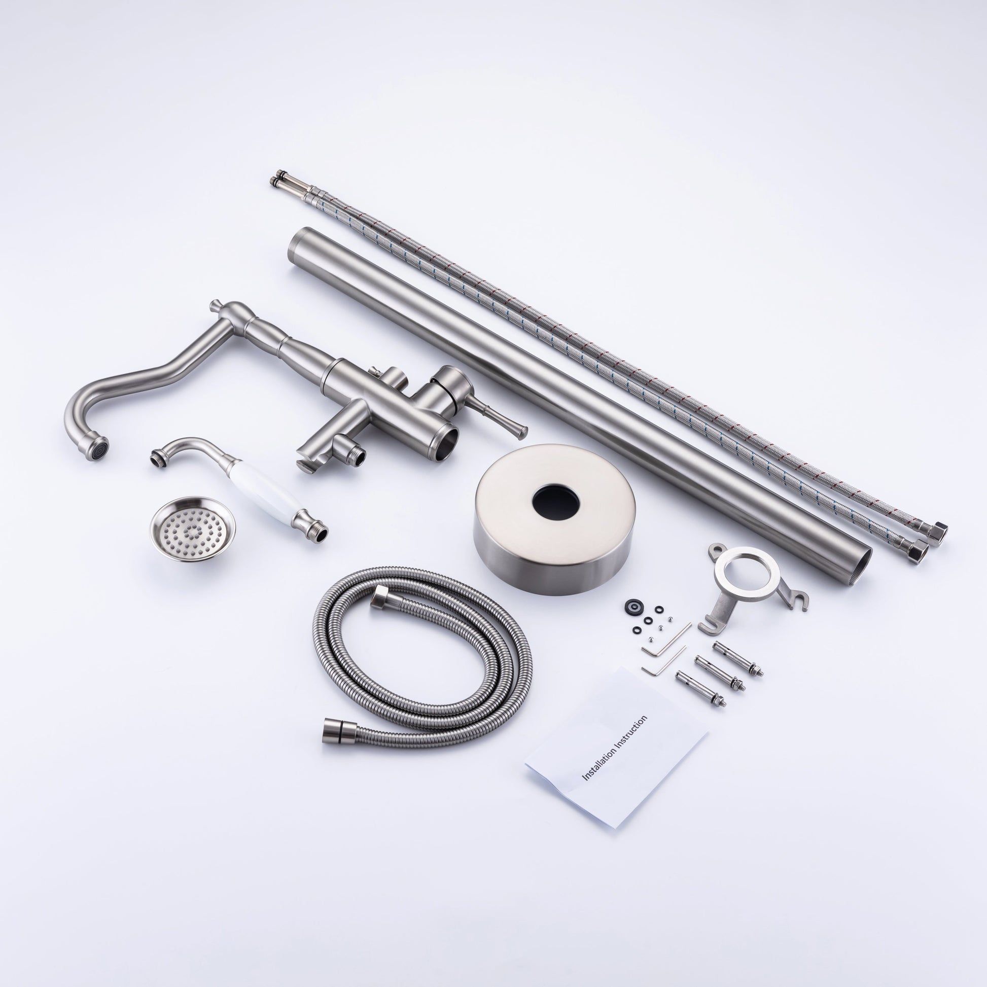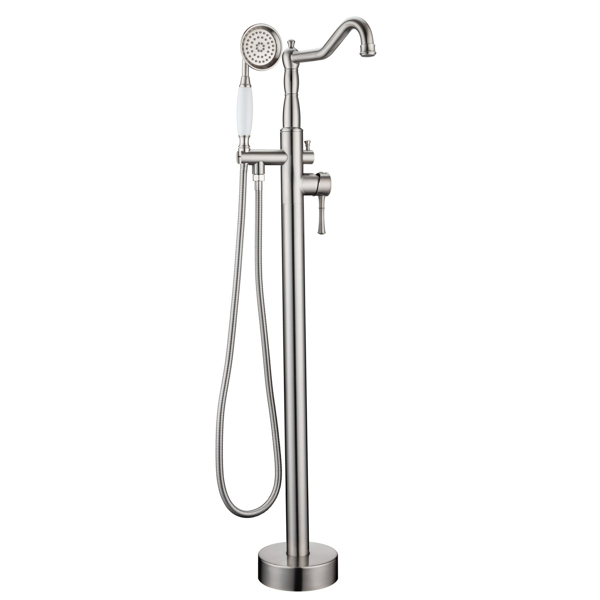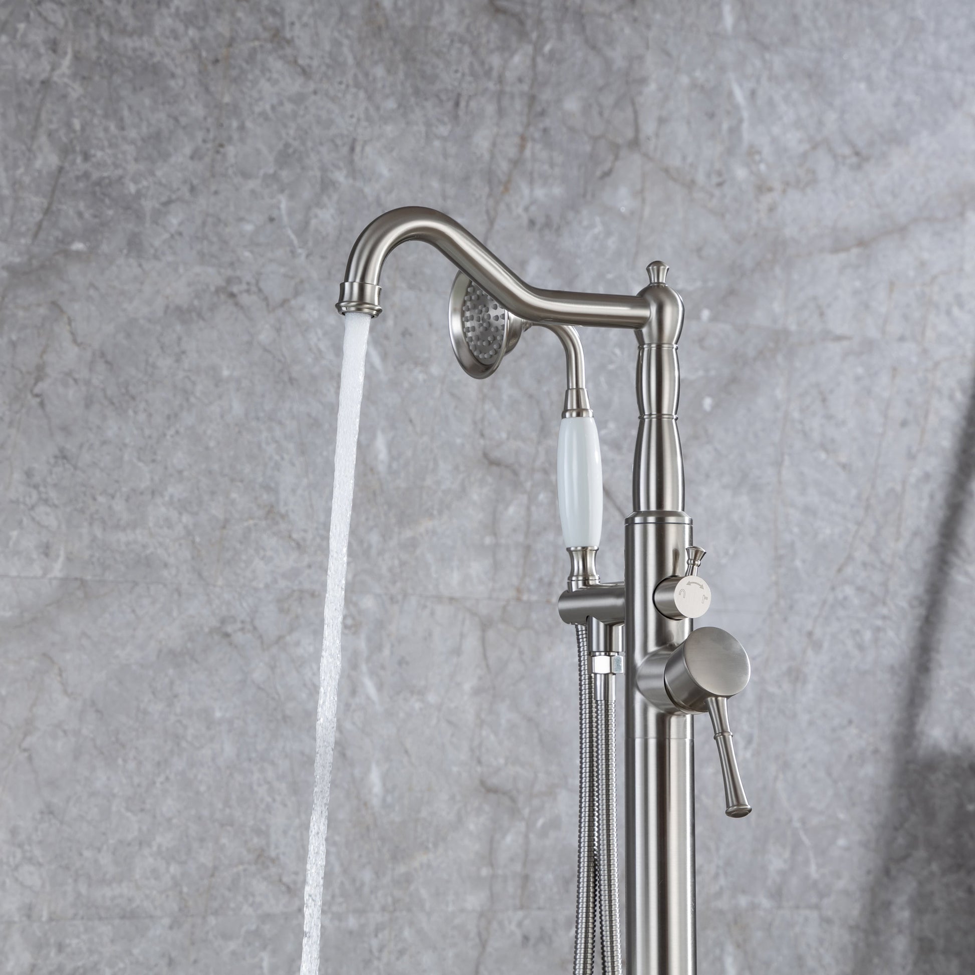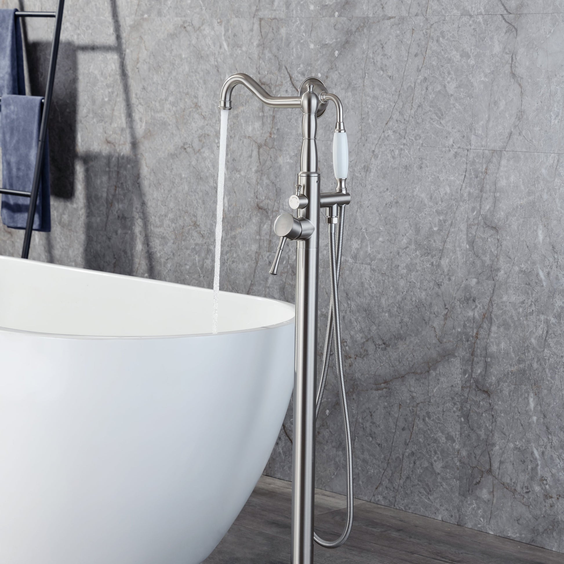 【Freestanding tub faucet diverter reset automatically when turn off】When turn off water , the diverter would reset automatically to the spout mode. Next time you use the gorgeous free standing tub filler, water would come out of the spout instead of handheld shower, avoiding getting sprayed on your face by the handheld shower. 【Long hose design for the floor mount bathtub faucet 】The handheld shower with 59'' long stainless steel hose, gets to every part of the tub to clean. 【Easy to install】You would get all you need to install the freestanding bathtub faucet, no need to buy rough-in. With clear instructions included in the package, you can install easily and get a stable bathtub filler with 9.84'' long swivel spout, handy sprayer, good water pressure. 【Great quality and classic design】The free standing faucet is made of quality brass and is extremely solid and heavy. Besides, our customers love the roman, elegant, vintage and classic look so much and say that it's even prettier in person. Available in four colors,including matte black, brushed nickel, chrome and oli-rubbed bronze. 【Note】Make sure your water supply could be 1.18-1.57'' below the finished floor. If you have any question, feel free to contact our frendly customer service.