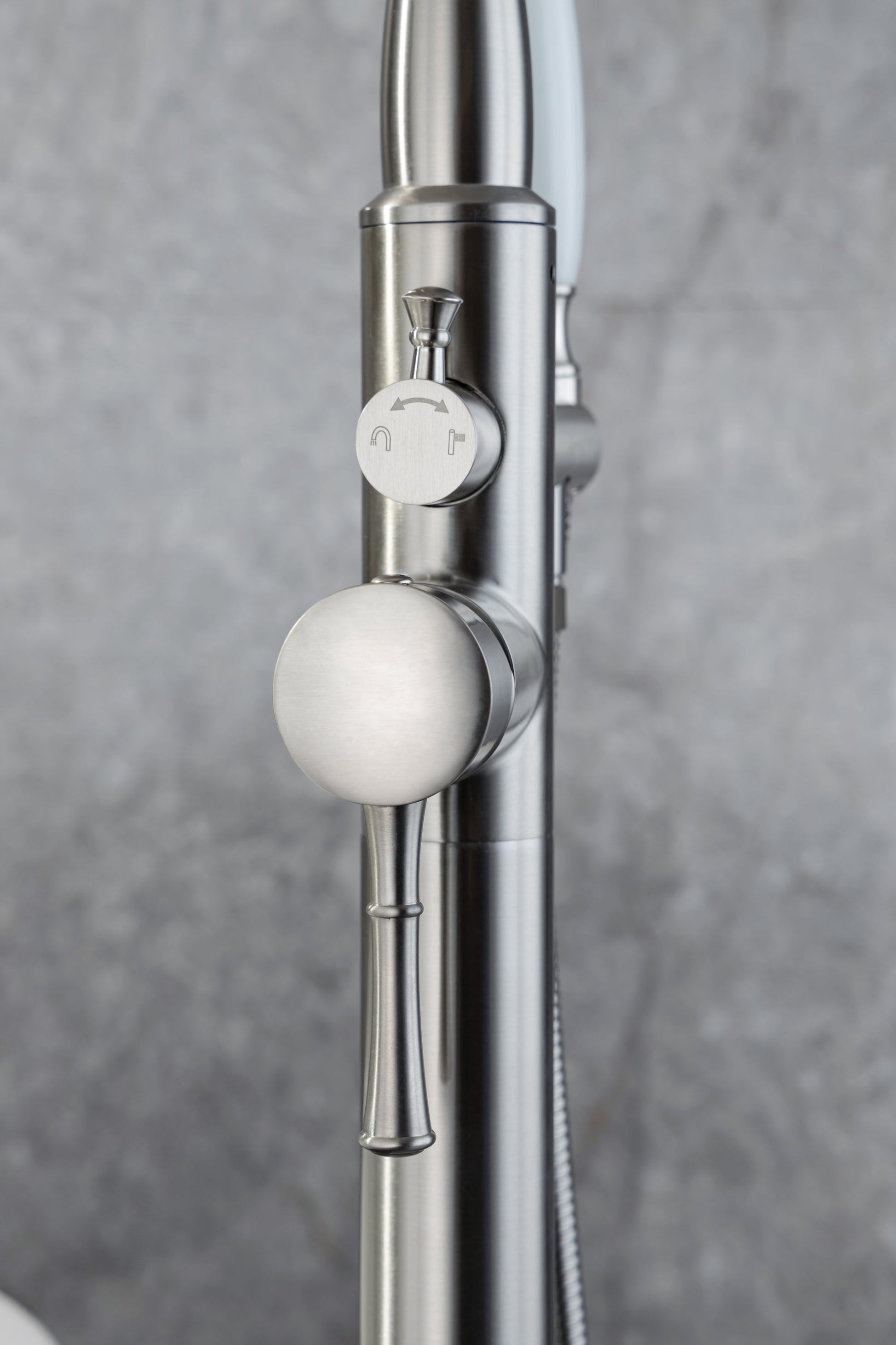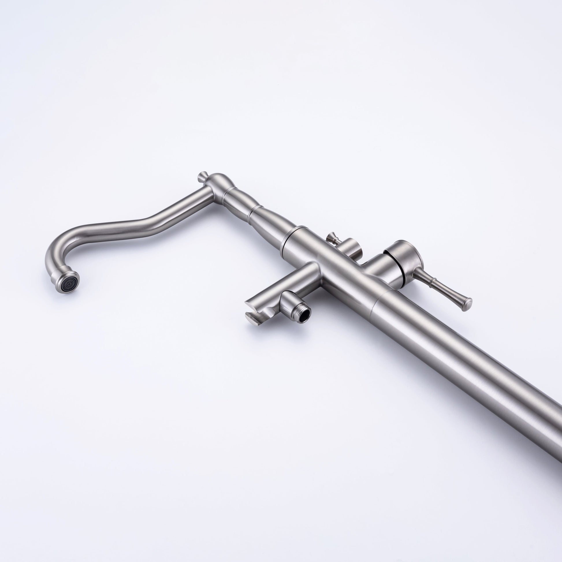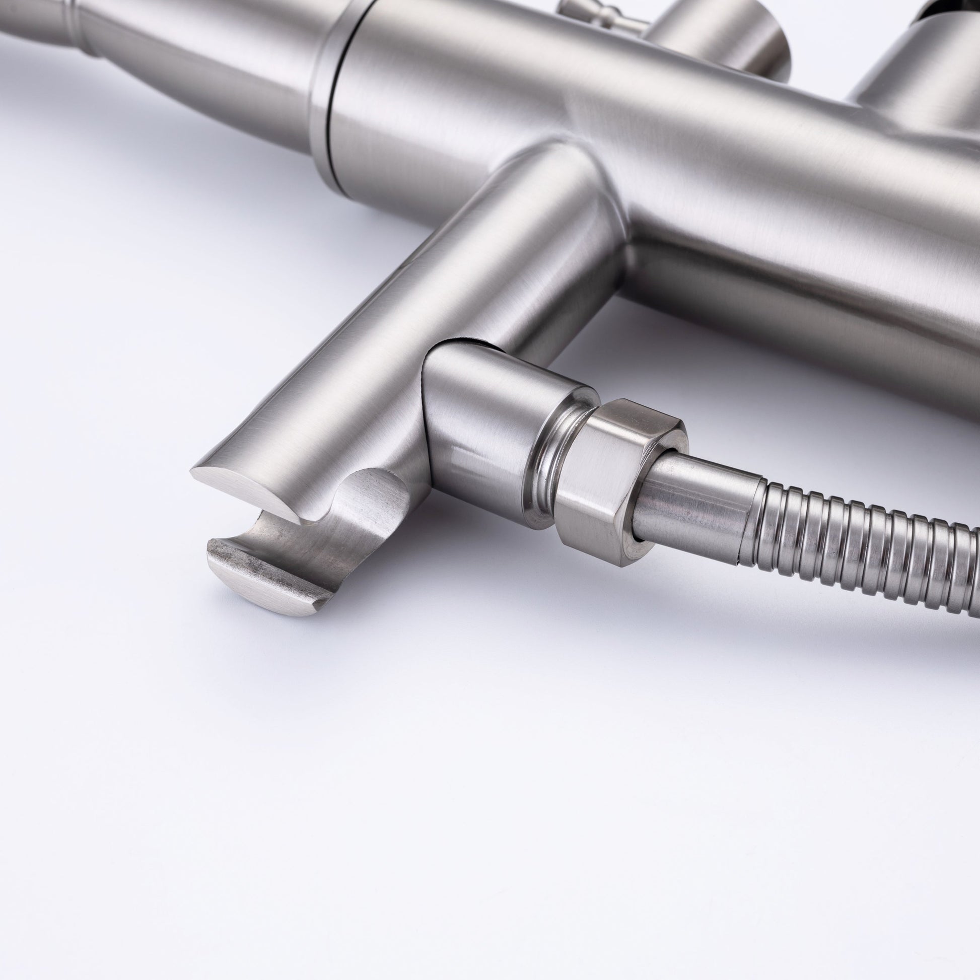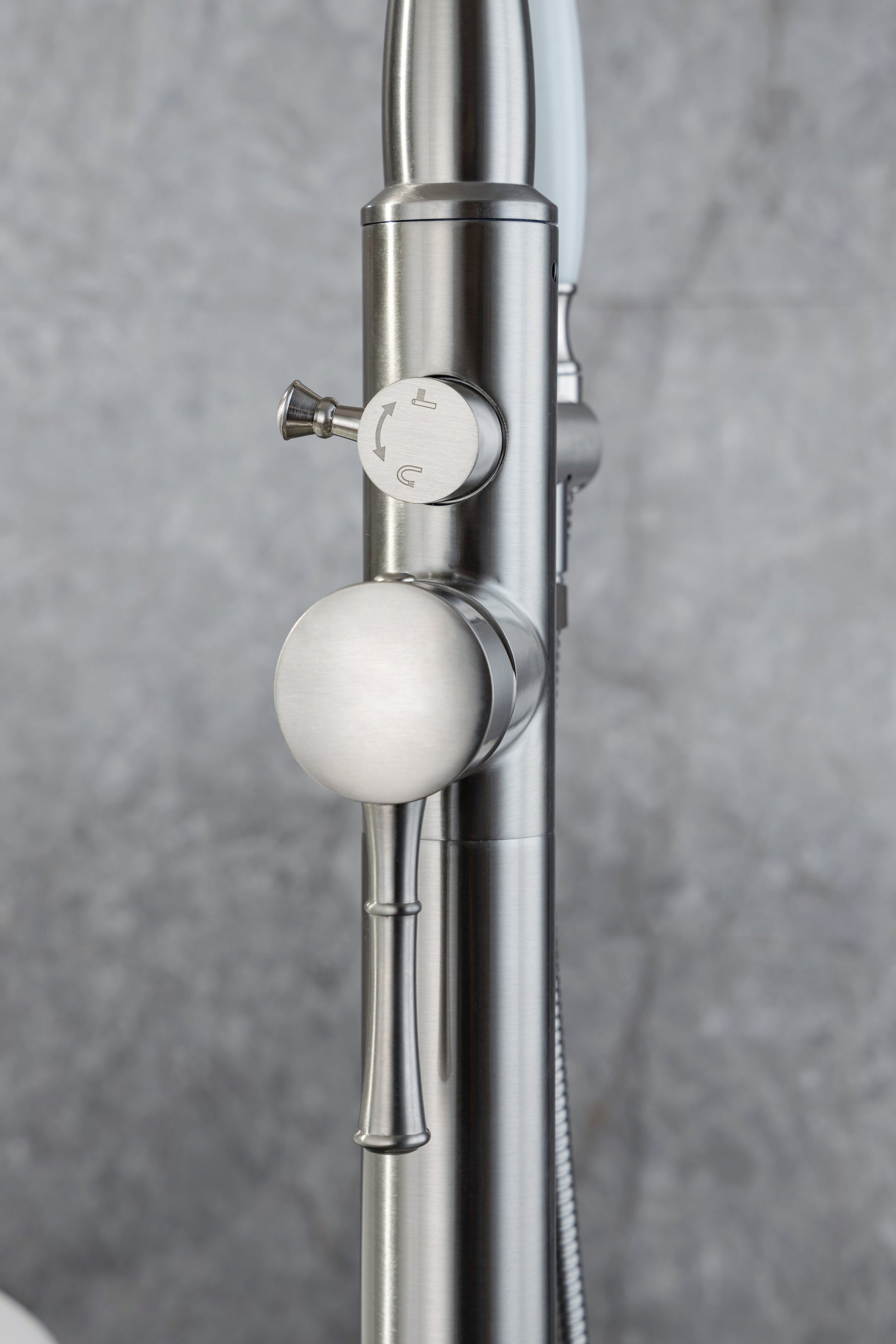 【Freestanding tub faucet diverter reset automatically when turn off】When turn off water , the diverter would reset automatically to the spout mode. Next time you use the gorgeous free standing tub filler, water would come out of the spout instead of handheld shower, avoiding getting sprayed on your face by the handheld shower. 【Long hose design for the floor mount bathtub faucet 】The handheld shower with 59'' long stainless steel hose, gets to every part of the tub to clean. 【Easy to install】You would get all you need to install the freestanding bathtub faucet, no need to buy rough-in. With clear instructions included in the package, you can install easily and get a stable bathtub filler with 9.84'' long swivel spout, handy sprayer, good water pressure. 【Great quality and classic design】The free standing faucet is made of quality brass and is extremely solid and heavy. Besides, our customers love the roman, elegant, vintage and classic look so much and say that it's even prettier in person. Available in four colors,including matte black, brushed nickel, chrome and oli-rubbed bronze. 【Note】Make sure your water supply could be 1.18-1.57'' below the finished floor. If you have any question, feel free to contact our frendly customer service.