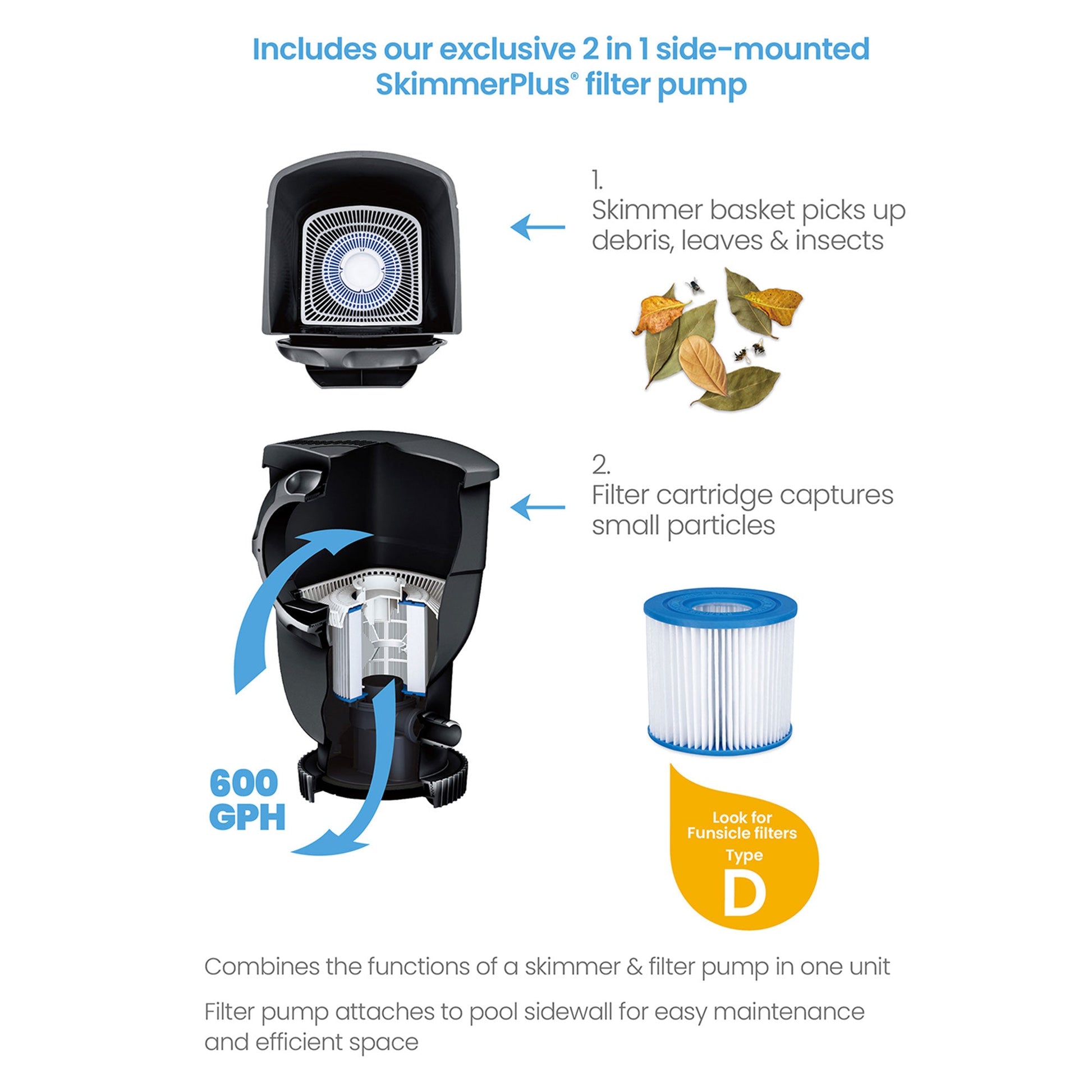 - Includes SFX600 SkimmerPlus Filter Pump and a JetMaxx Aeration feature, providing you with cleaner, purer water, Type D filter cartridge, SureStep ladder, and repair patch