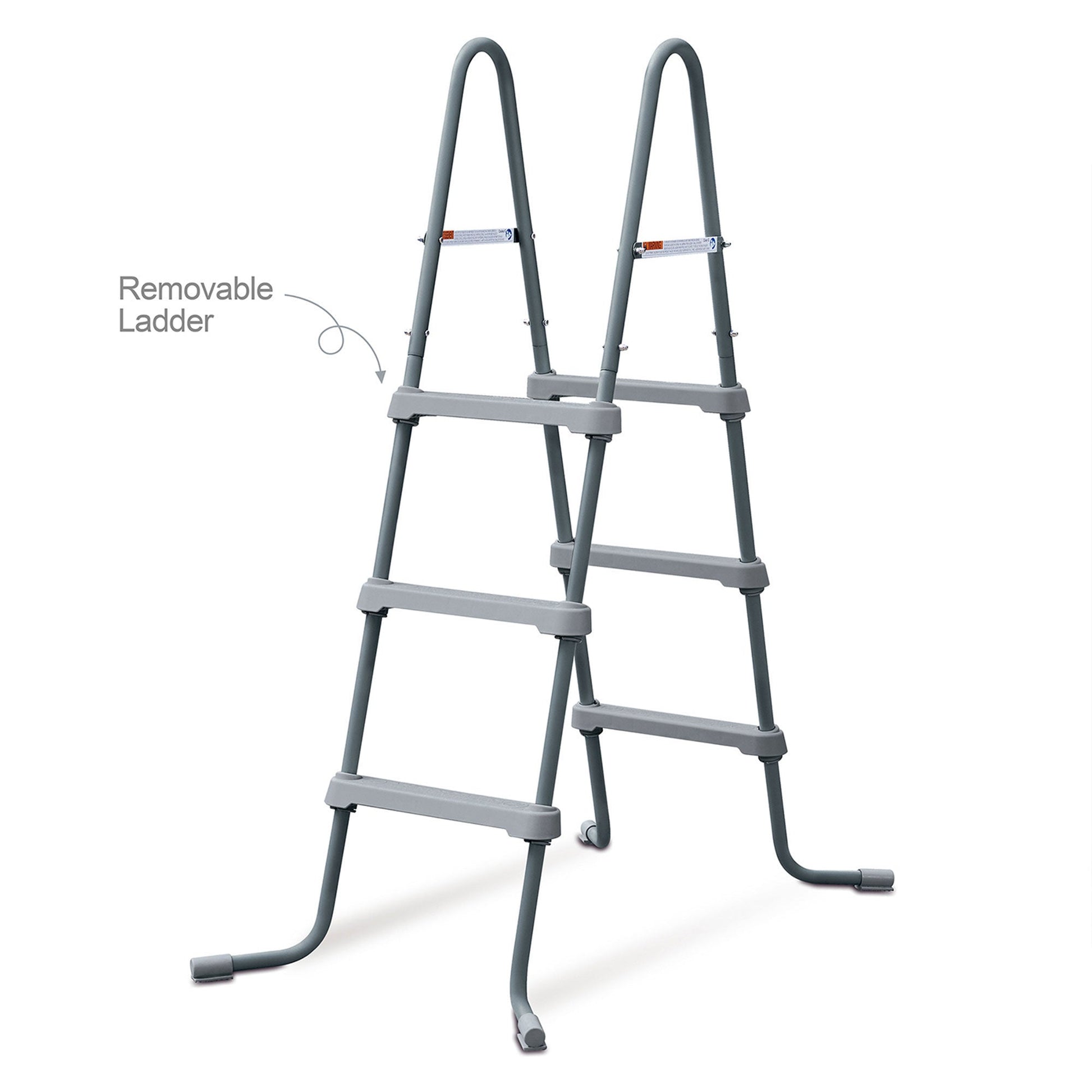 Meanwhile, the above-ground swimming pool features SmartConnect technology for quick setup. Simply connect the poles together until there’s a “click”, and the pool's structure will remain strong and secure. The modern matte finish prevents scratches and corrosion. The included SkimmerPlus Filter pump and durable pool cover ensure the water stays clean all day. For keeping your pool extra clean, the Deluxe Maintenance kit is provided. A SureStep ladder is included to safely enter and exit the pool, and a ground cloth is also provided for extra puncture protection.