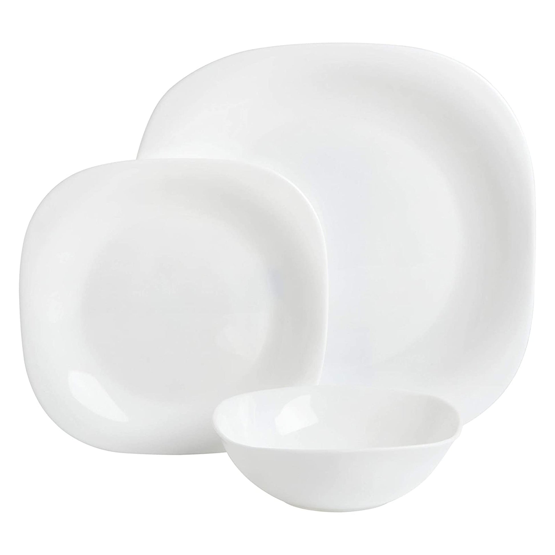 Delight in the perfect backdrop for your home-cooking creations with the Gibson Home Break and Chip Resistant Square Dinnerware Set in Opal. This 18-piece dinnerware set is the perfect meeting place between classic style and everyday functionality. The classic curved shape looks great with any table setting and provides additional surface area for showing off delicious homemade meals. The shape is also functional, allowing for a stackable and space-saving design for easy storage in china and kitchen cabinets. No matter what the occasion is this durable porcelain set is the versatile service set you need in your home. All items are made of a strong glass material that is made to be chip and break-resistant for a lightweight yet durable set that is safe and convenient for everyday use and dishwasher and microwave safe. The set offers service for 6 including 6 dinner plates, 6 dessert plates, and 6 soup bowls. Serve up classic elegance for every meal with the Gibson Home Break and Chip Resistant Square Dinnerware Set in Opal.