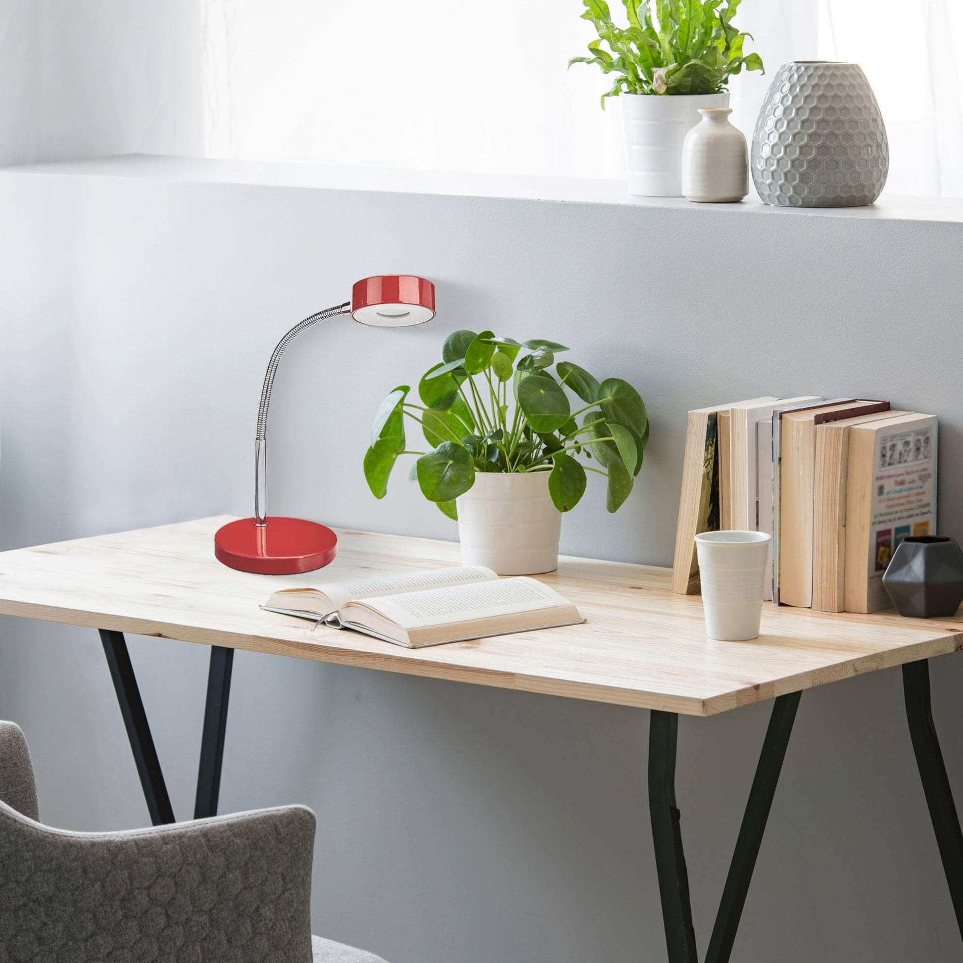- Adorned in a captivating glossy red finish and featuring a stylish chrome gooseneck, this lamp adds a touch of modern flair to any workspace