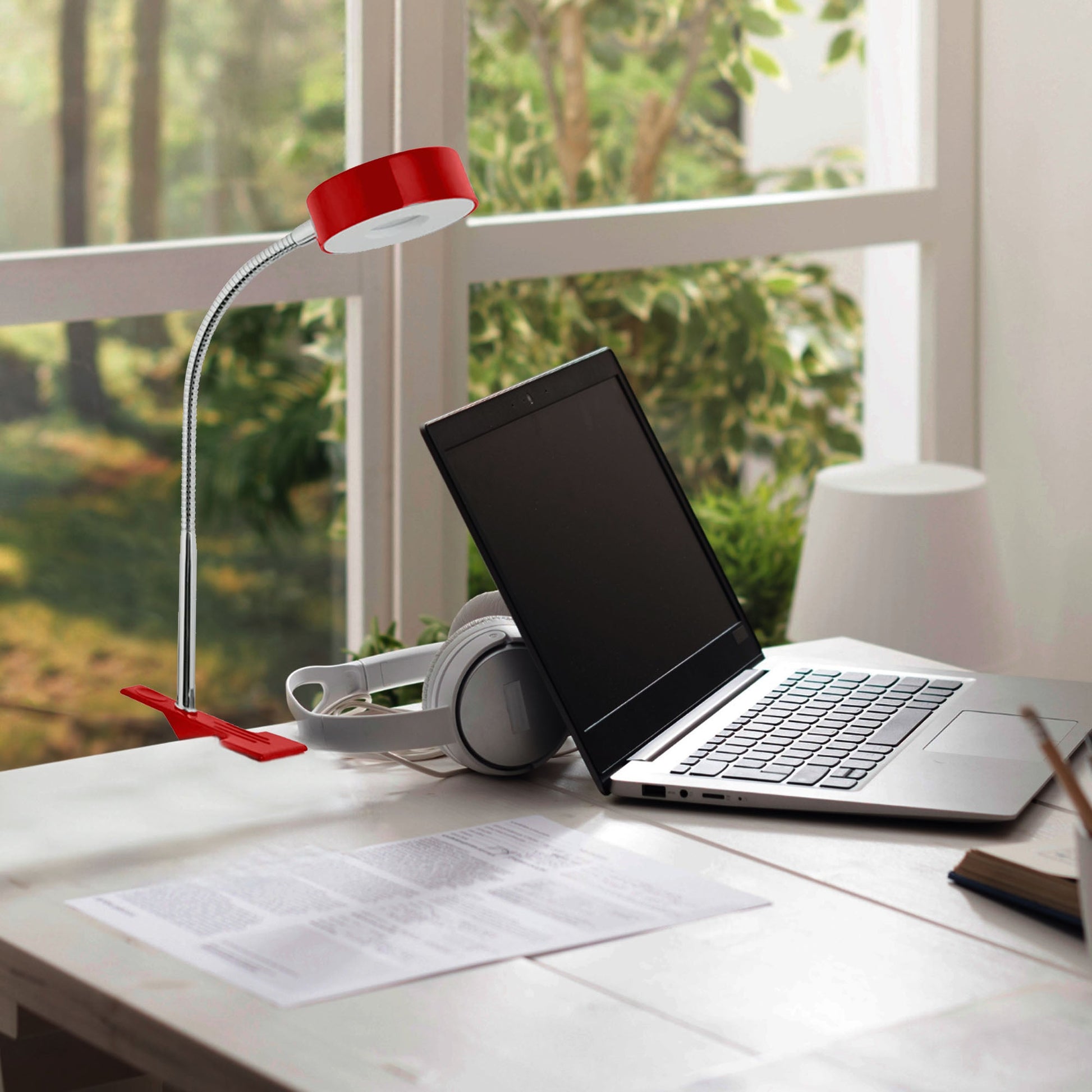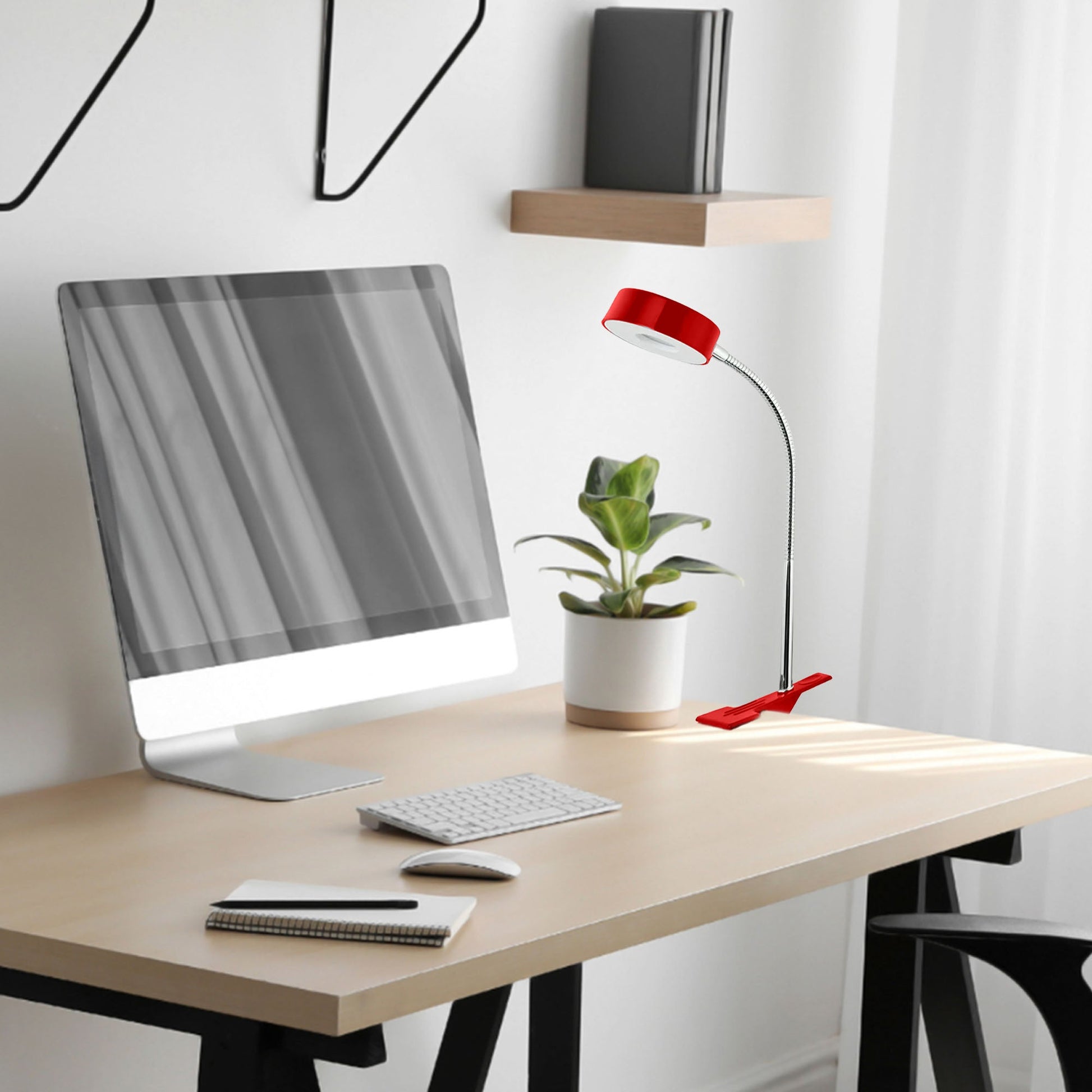 - Adorned in a captivating glossy red finish and featuring a stylish chrome gooseneck, this lamp adds a touch of modern flair to any workspace