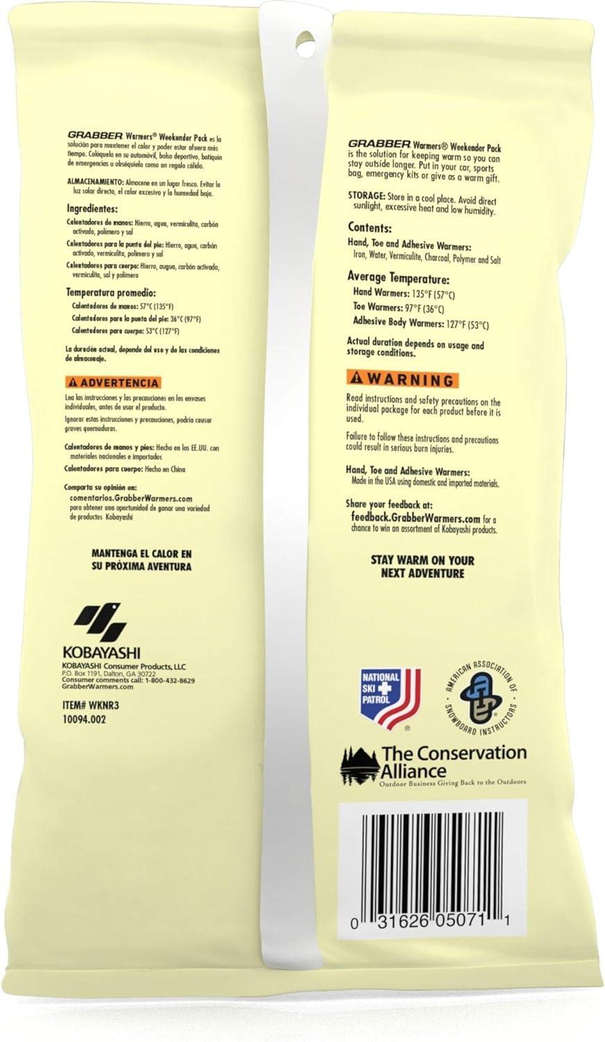 Stay warm on your next outdoor adventure with the Grabber® Weekender Pack! Each pack contains two Hand Warmers, two Toe Warmers and two Peel ‘N Stick Body Warmers. Great for home, car, work or to give as a warm gift. Grabber warmers are odorless and long-lasting sources of personal heat.