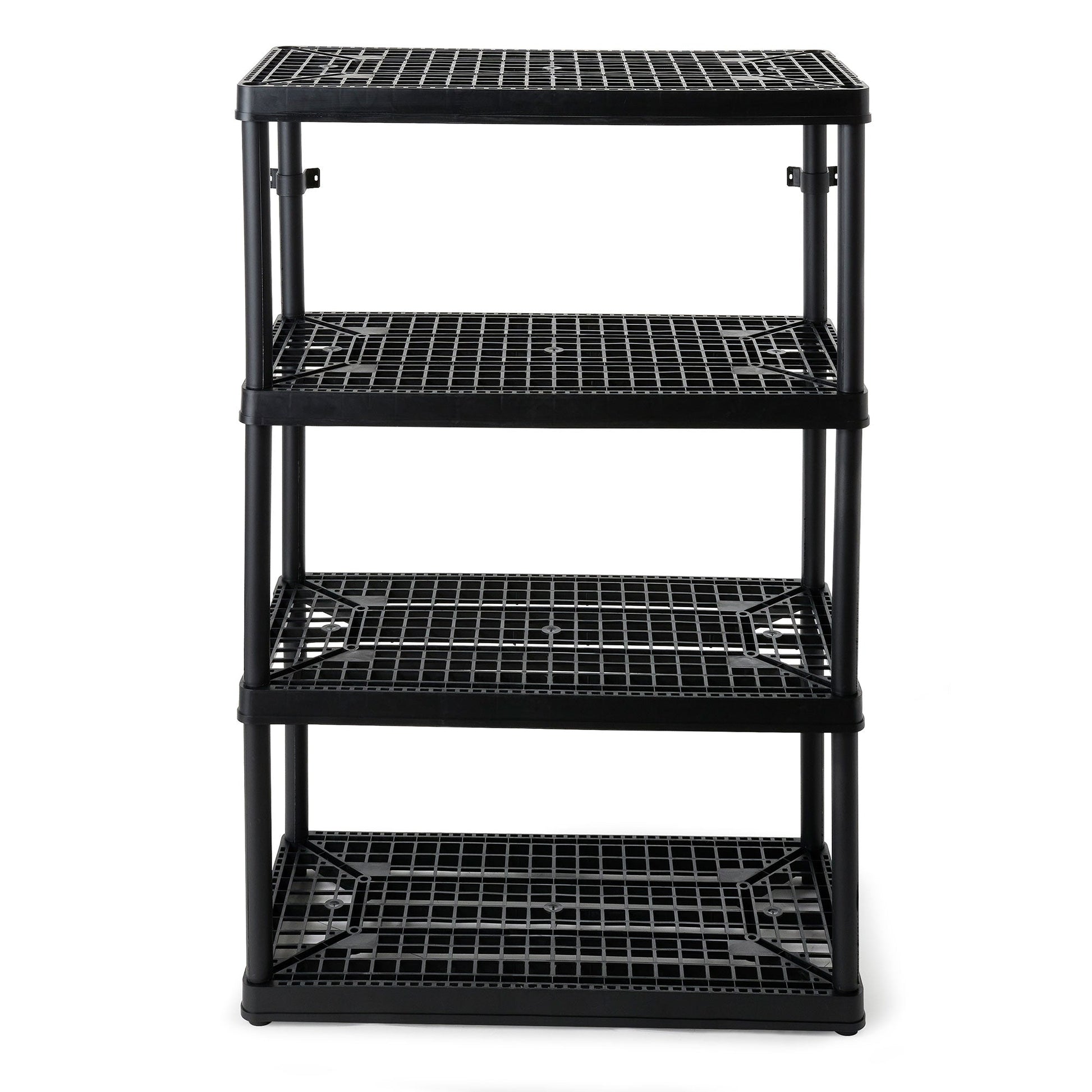 This bathroom storage shelf showcases timeless elegance for functional spaces with its lightweight, plastic construction and sleek color. Easily snap together for a simple installation process, and interconnect with additional units side-by-side for more storage space. Each ventilated shelf supports up to 150 pounds, providing a 600-pound unit capacity overall. Make sure that you distribute the weight evenly on the shelves for optimal, lasting use. With the 4 fixed shelves, you can organize laundry supplies, seasonal clothing items, home decor, toys, crafts, or tools. The closet storage shelf measures 18 inches long, 36 inches wide, and 54.5 inches tall offering a storage solution for any room. For added versatility, you can use the included brackets to mount the plastic shelves to the wall.