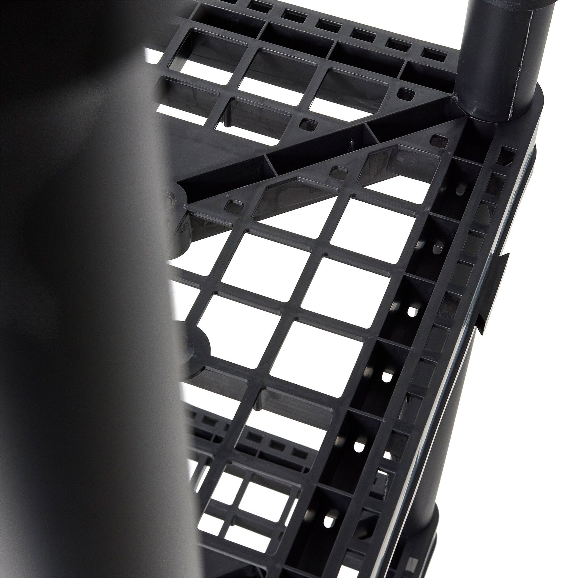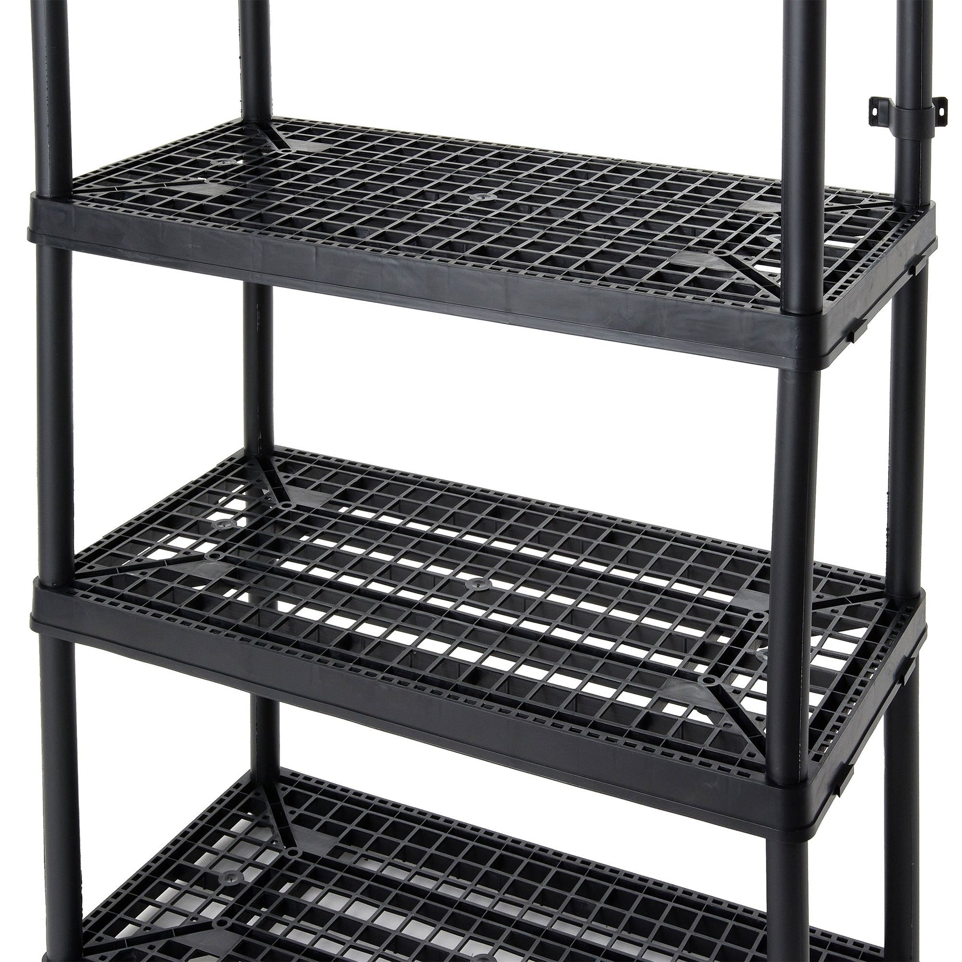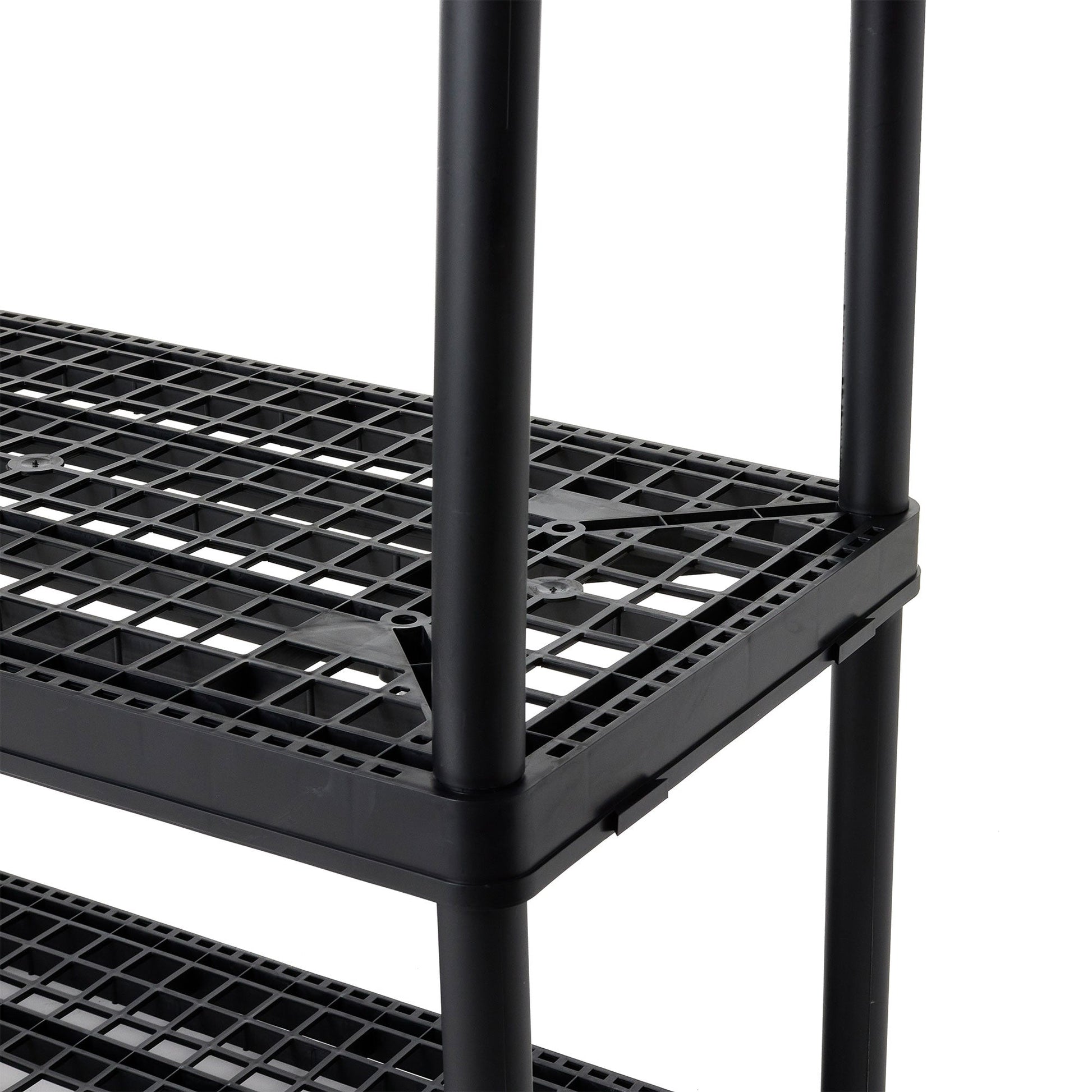 - Constructed from durable plastic, this utility rack resists rusting, denting, and peeling