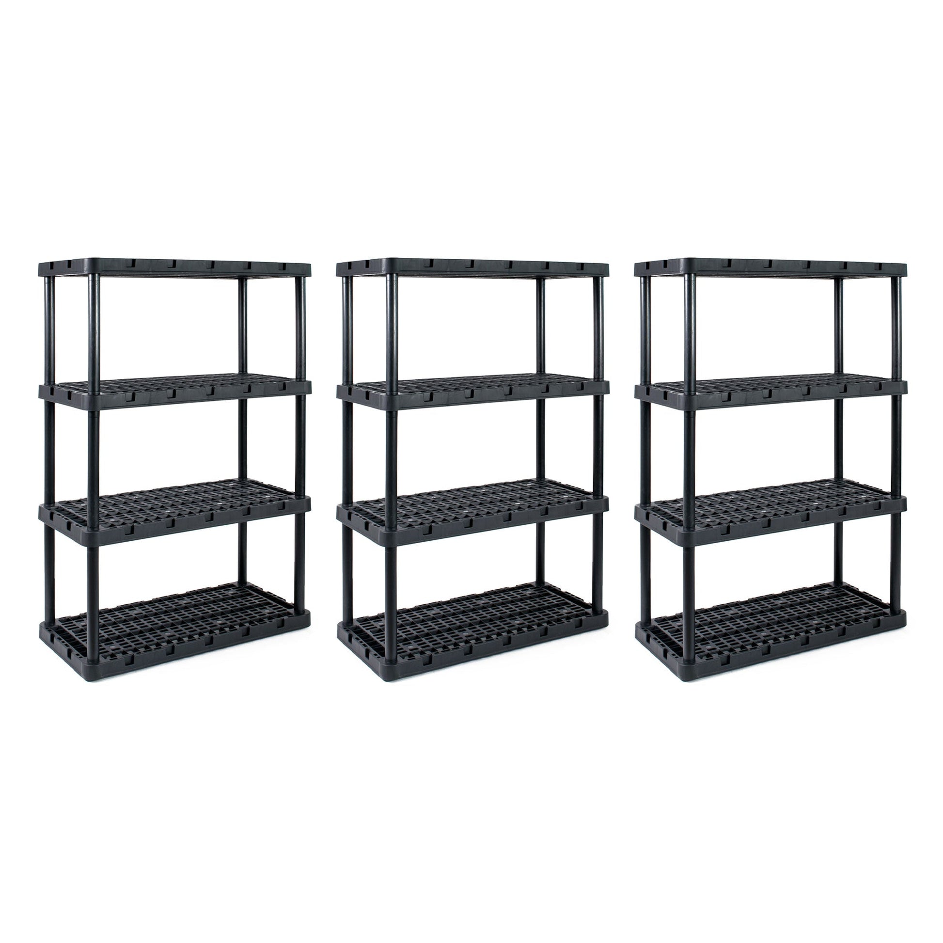These plastic storage shelves can function as your garage storage or shelf organizer, allowing you to easily organize and store various items. With its simple, no-tool setup, lightweight body, and black coloring, you can easily make this storage unit work in any room of the house. Easily snap all the included parts of this multi-purpose unit together for a simple, no-stress installation process. Plus, with the Knect-A-Shelf feature, you can interconnect multiple units from any side for added storage space (additional units sold separately).