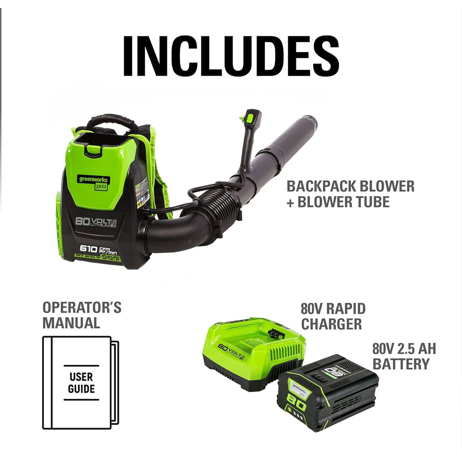 Greenworks Cordless Backpack Blower with 80 Volt 2.5Ah Battery & Charger, Green