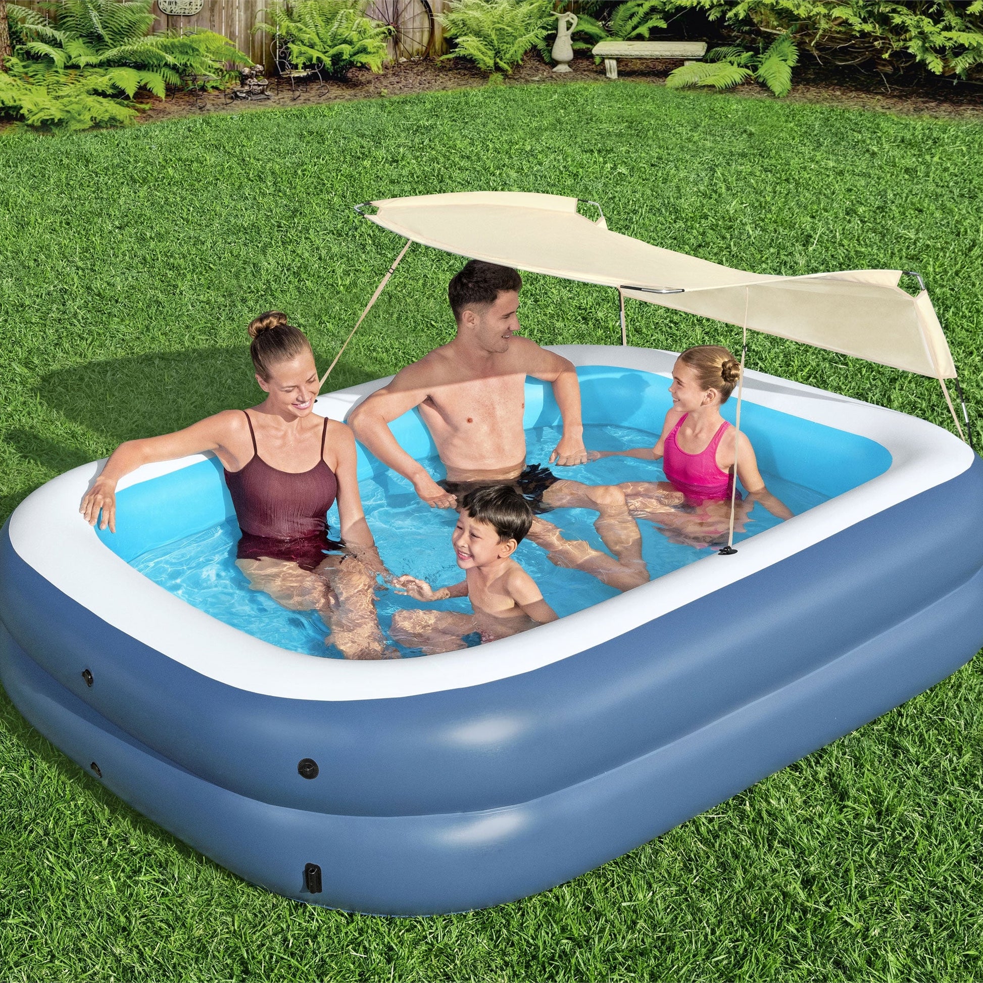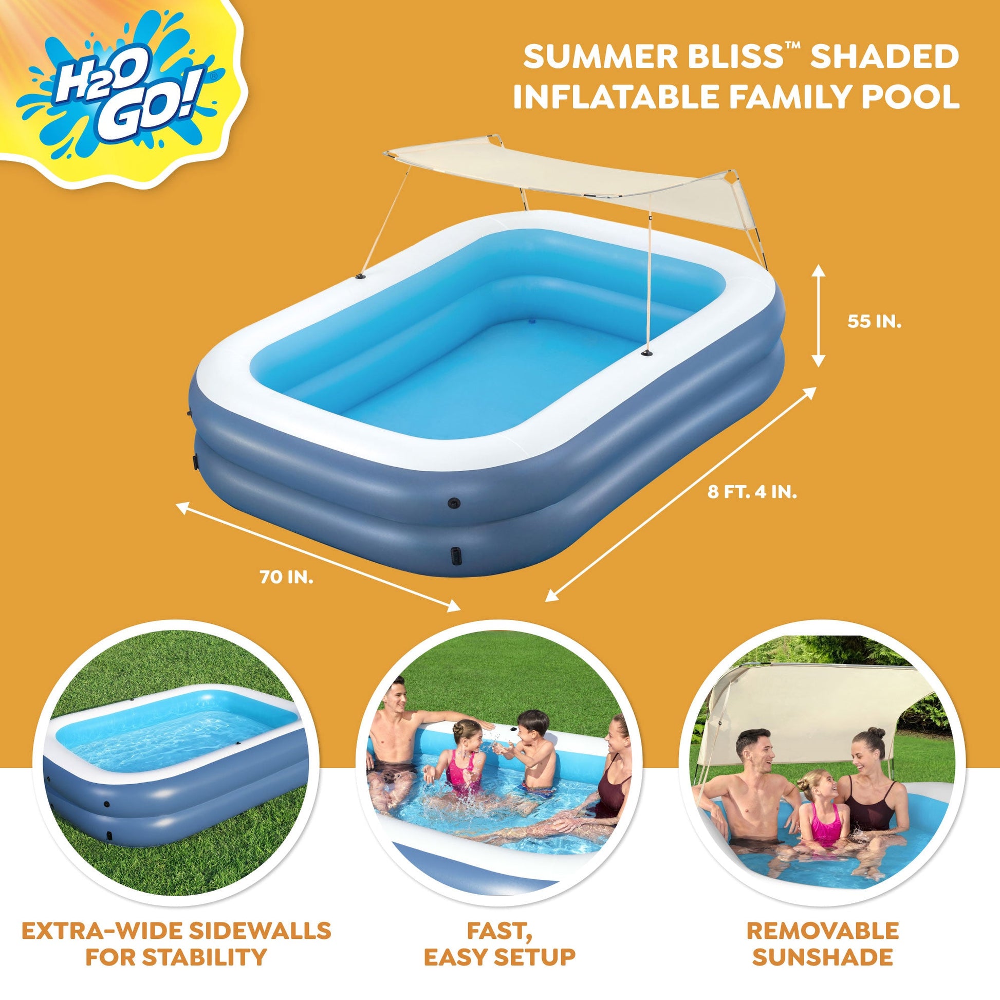 Don't let the heat keep you indoors and get ready for an unforgettable summer. Enjoy quality time together while staying cool and protected in the sunshine. Create cherished memories with your family in the Summer Bliss Shaded Inflatable Family Pool from H2OGO!.