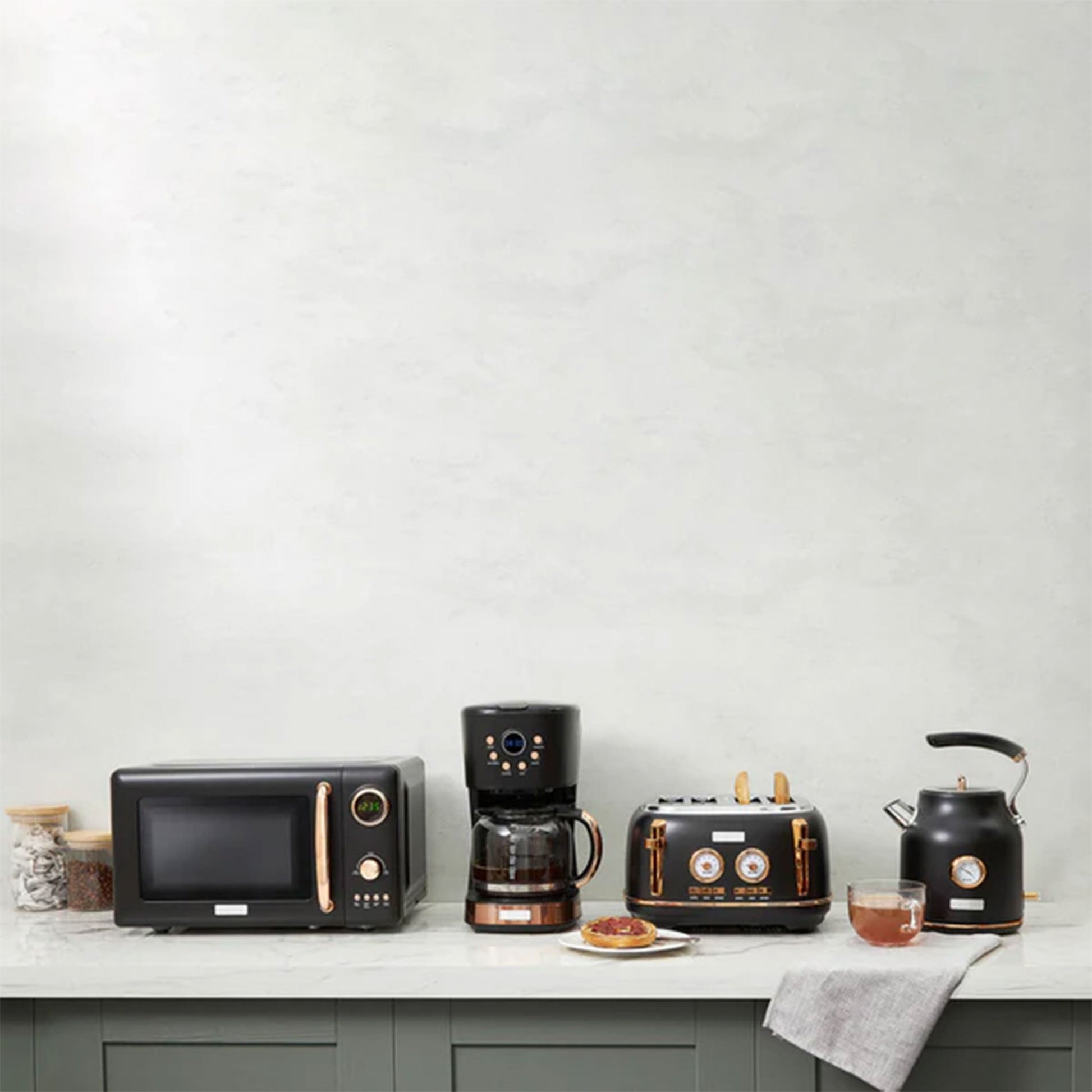 Inspired by British homes, architecture, and landscapes, the Haden microwave and Dorset Kettle feature a chic Black & Copper color scheme.