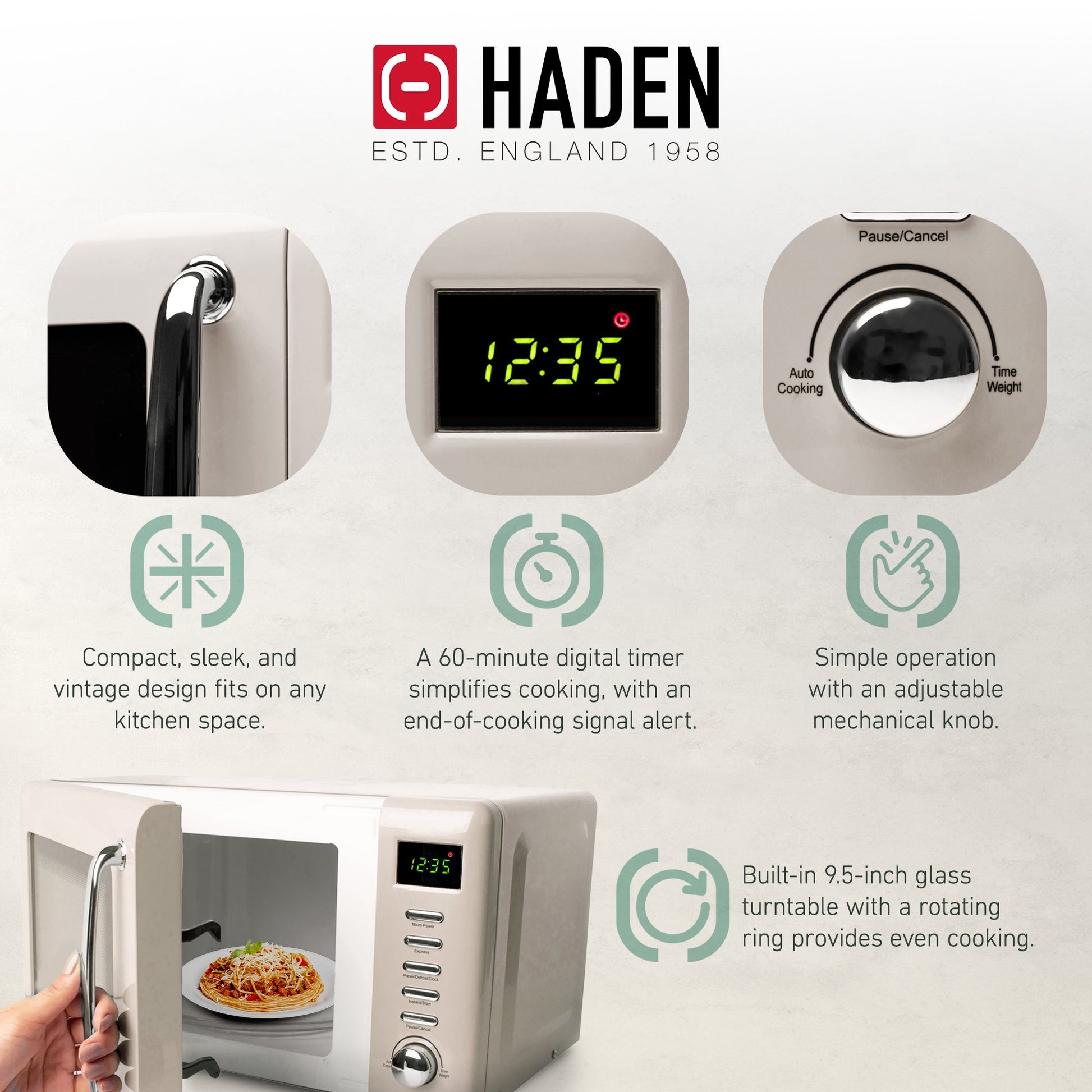 - Easy to use with digital controls, 5 power levels for controlled heating, plus convenient defrost/reheat/cooking functions