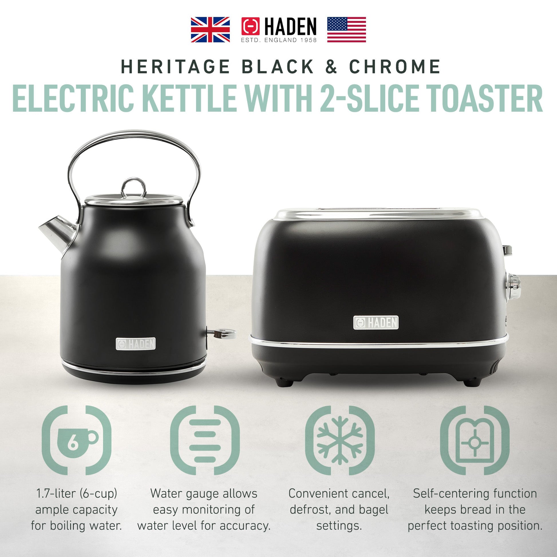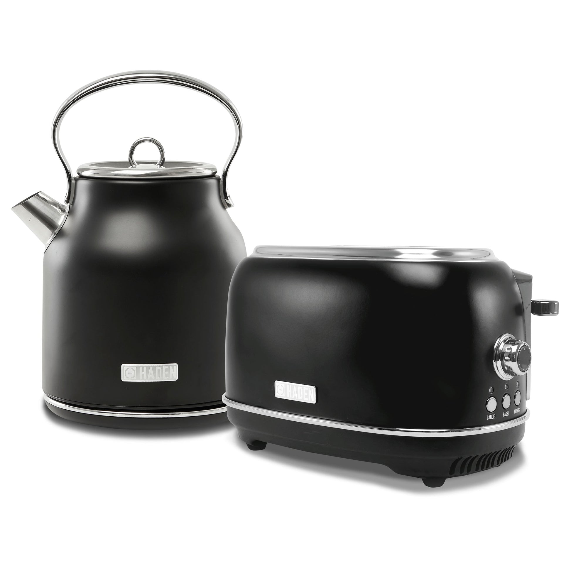 Inspired by British homes, architecture, and landscapes, this HADEN Heritage toaster and kettle feature a chic Black & Chrome color scheme.