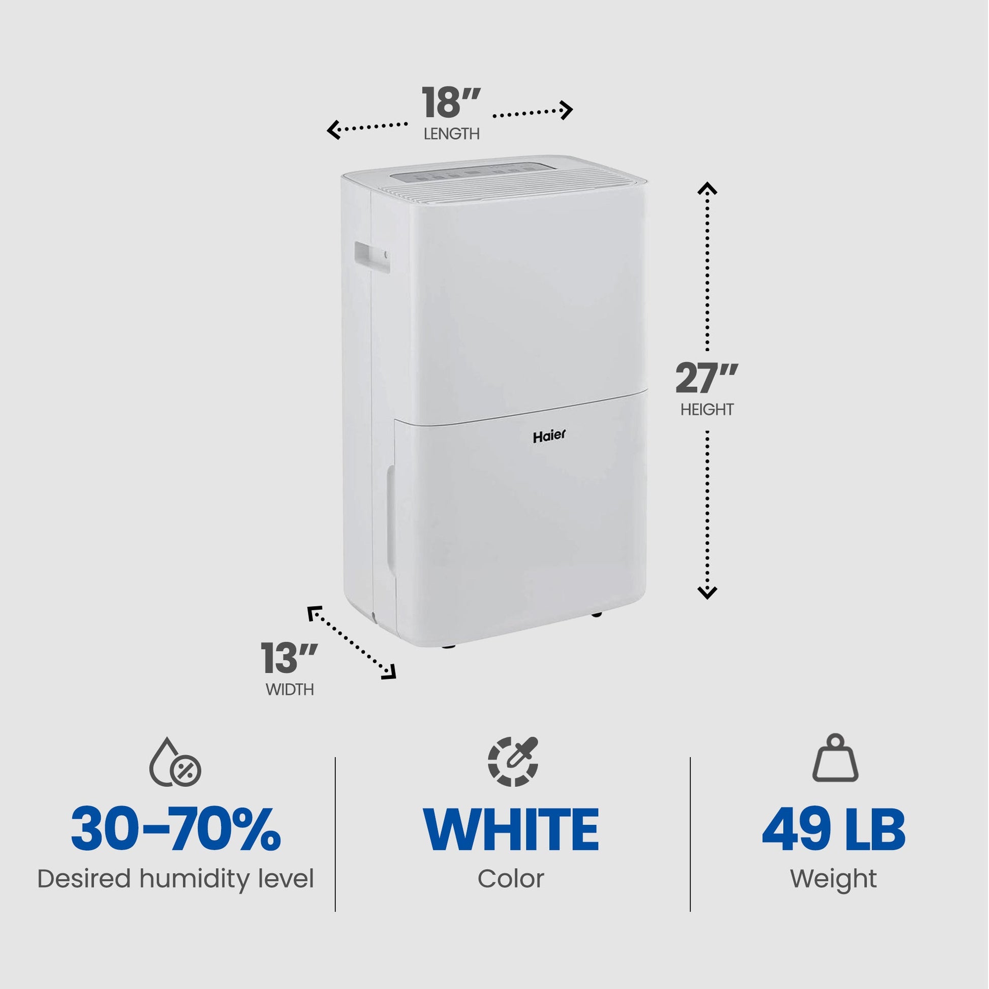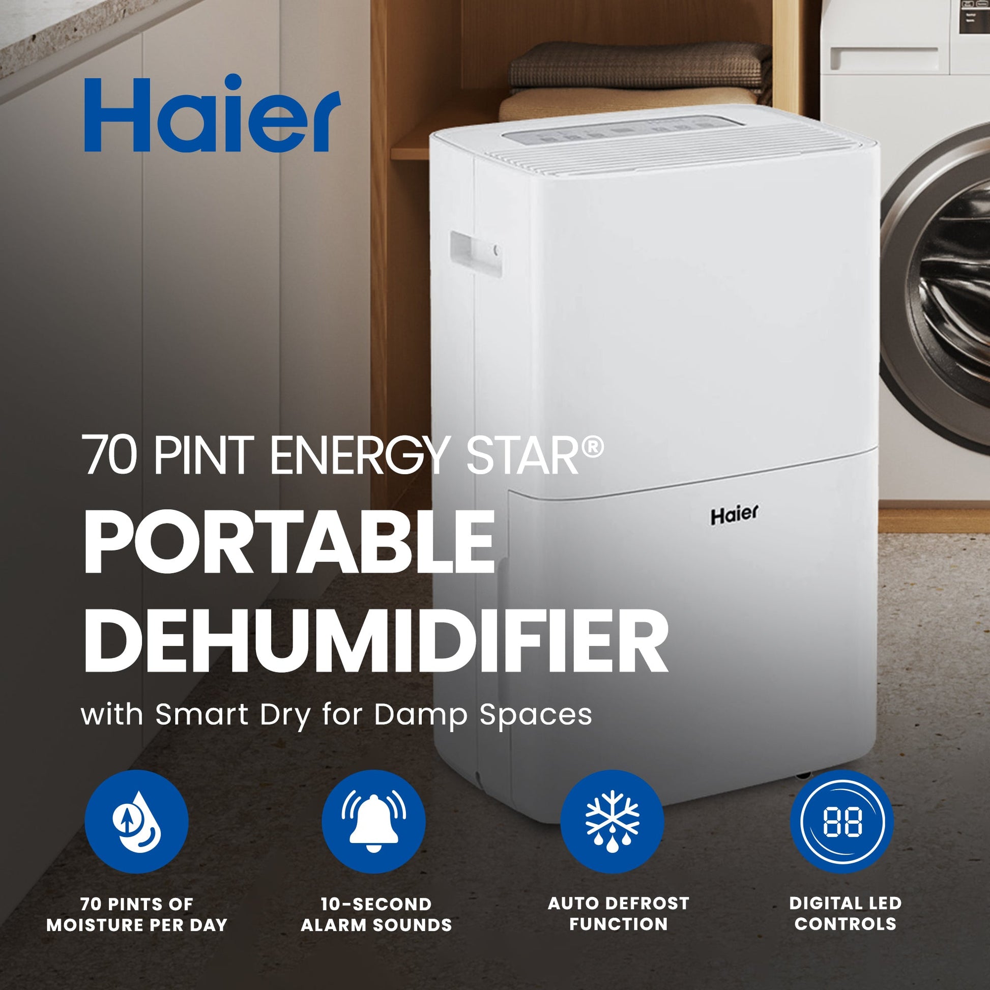 Experience superior comfort and efficiency with the Haier 70 Pint Energy Star Portable Dehumidifier with Smart Dry.