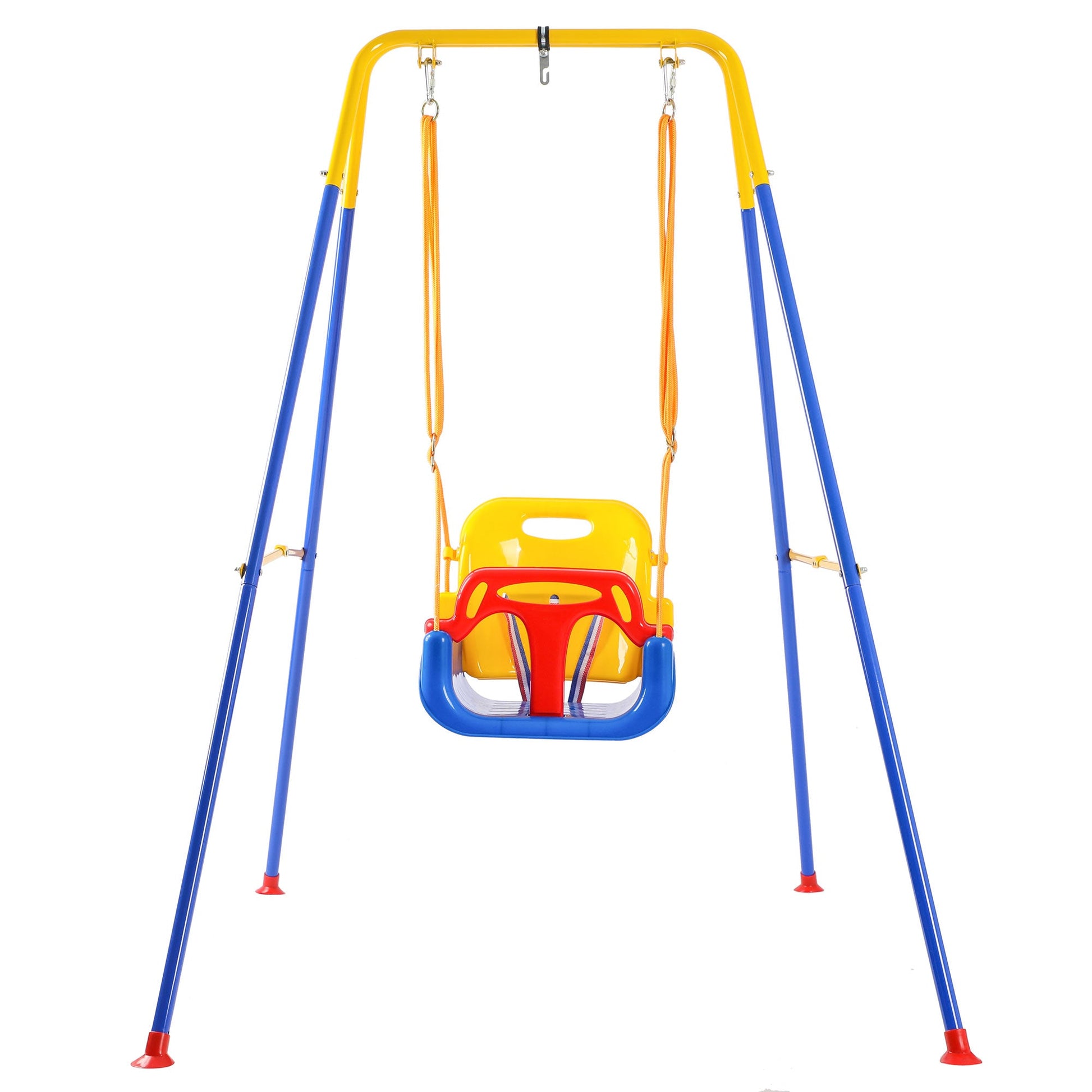 Ideal for indoor and outdoor play, your little one can enjoy secure exciting swinging fun wherever you set this swing set up, whether in your backyard, patio, or playroom. The durable metal frame is powder-coated to resist corrosion, ensuring it withstands the elements and remains strong for years of enjoyment. With a weight capacity of up to 135 pounds, this durable swing set is designed with your child's safety in mind.