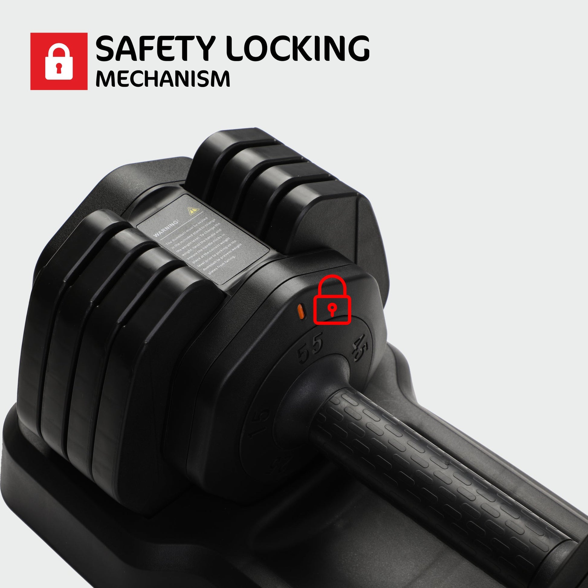 This 5-in-1 dumbbell is ideal for workouts for beginners through to fitness fanatics. With the 5 weight options ranging from 15 to 55 pounds within one compact setup, you can forget about extensive dumbbell sets and a cumbersome rack. Easily choose your preferred weight by putting the dumbbell on its tray and rotating the handle, saving you from hassle when customizing the weight. The lifting equipment also has a clicking sound when adjusting the weight amount, so you know when you are locked in. Featuring a safety-locking mechanism, this secures the plates to both the handle (to avoid plates falling) and to the adjacent plate (to prevent plates from sliding).