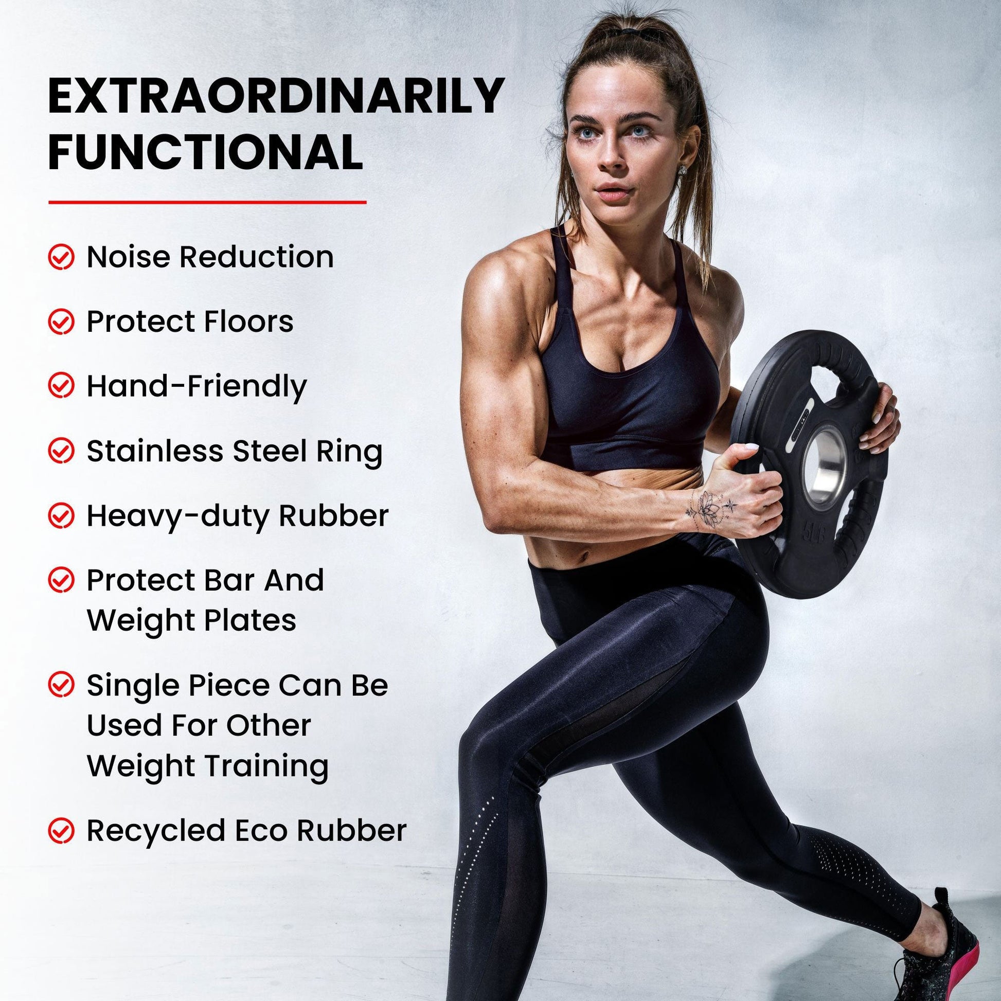 These weight plates are expertly made from high-density rubber and have unmatched durability, allowing them to withstand even the most strenuous exercises and repeated drops. These plates safeguard your flooring from harm and your strength bar from deterioration with the sturdy stainless steel inserts, ensuring long-lasting use. Featuring 3 ergonomic grips inside the edges, you can use it for more than just barbell or curl bar workouts. With a comfortable handle, you can easily hold the weight while completing sit-ups, executing lunges, or doing other full-body exercises.