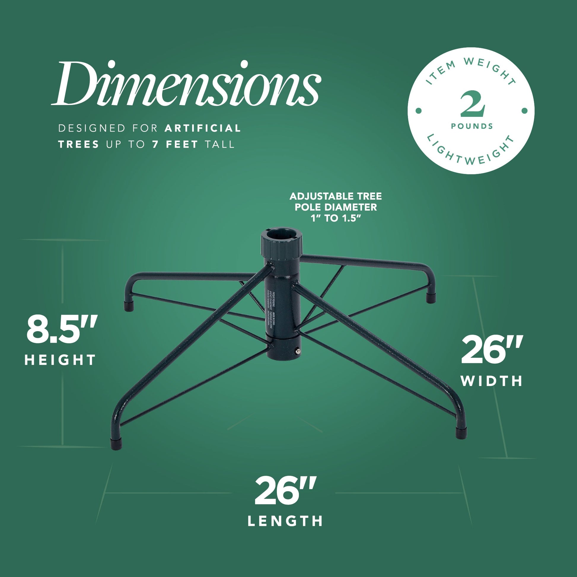 - Base measures 26 inches in diameter and 8.5 inches tall for increased support of various tree heights, including tall trees