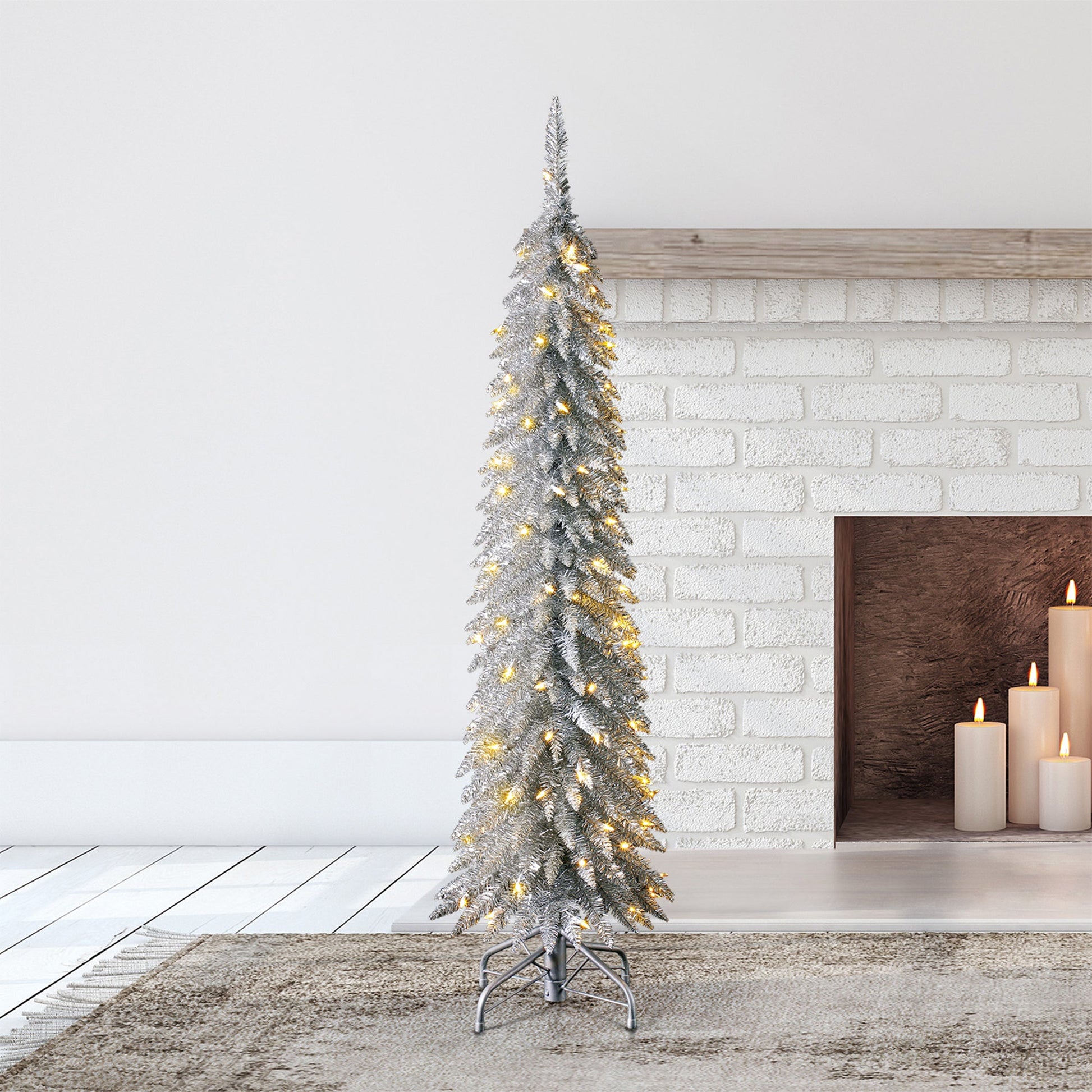 This tree's elegant pencil shape cuts a sleek 5-foot profile that has a modern appeal without taking up too much space in your home. Having a fake tree cuts out all the mess and hassle of a real tree and is a great option for people with allergies. The tinsel branches are prelit with warm white LED lights that provide an enchanting glow against sparkling ornaments and tinsel, making for a truly dazzling focal point in any space. It comes with a sturdy metal stand for a safe and sturdy centerpiece in your home.