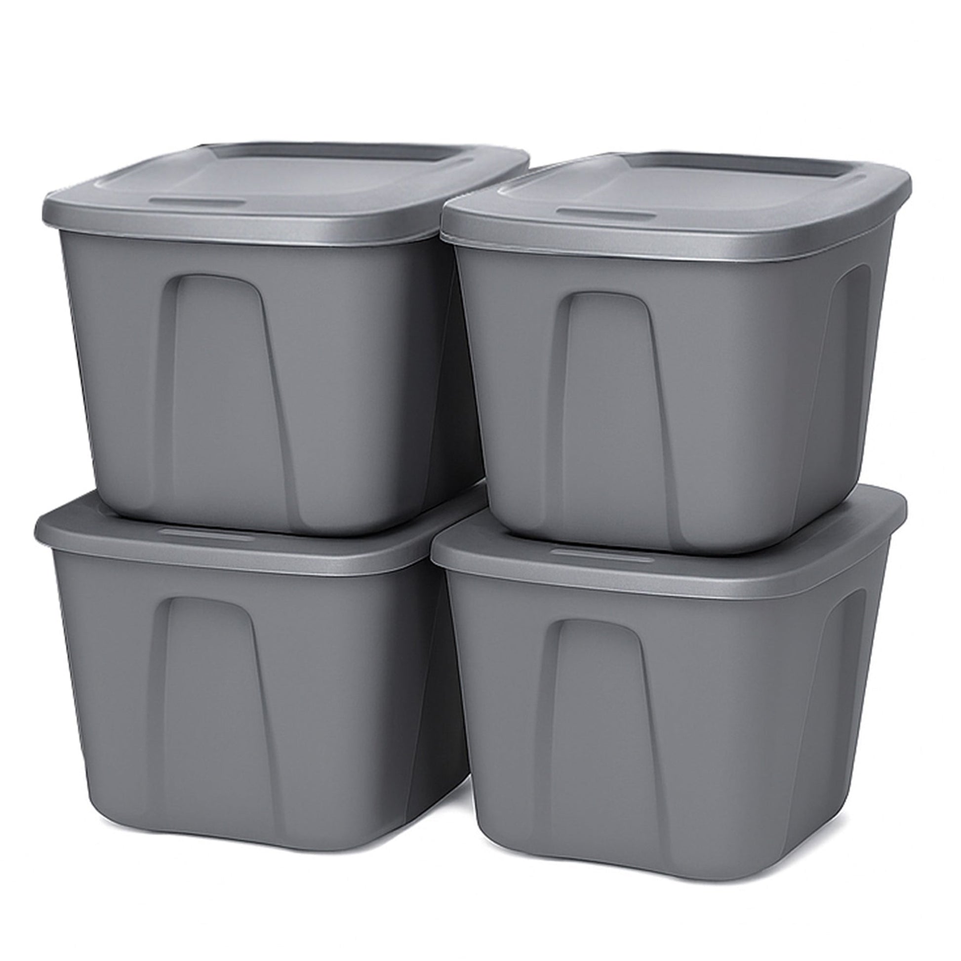 - Set of (4) durable storage container bins with a spacious 10-gallon capacity each that provides ample room for storing a variety of items