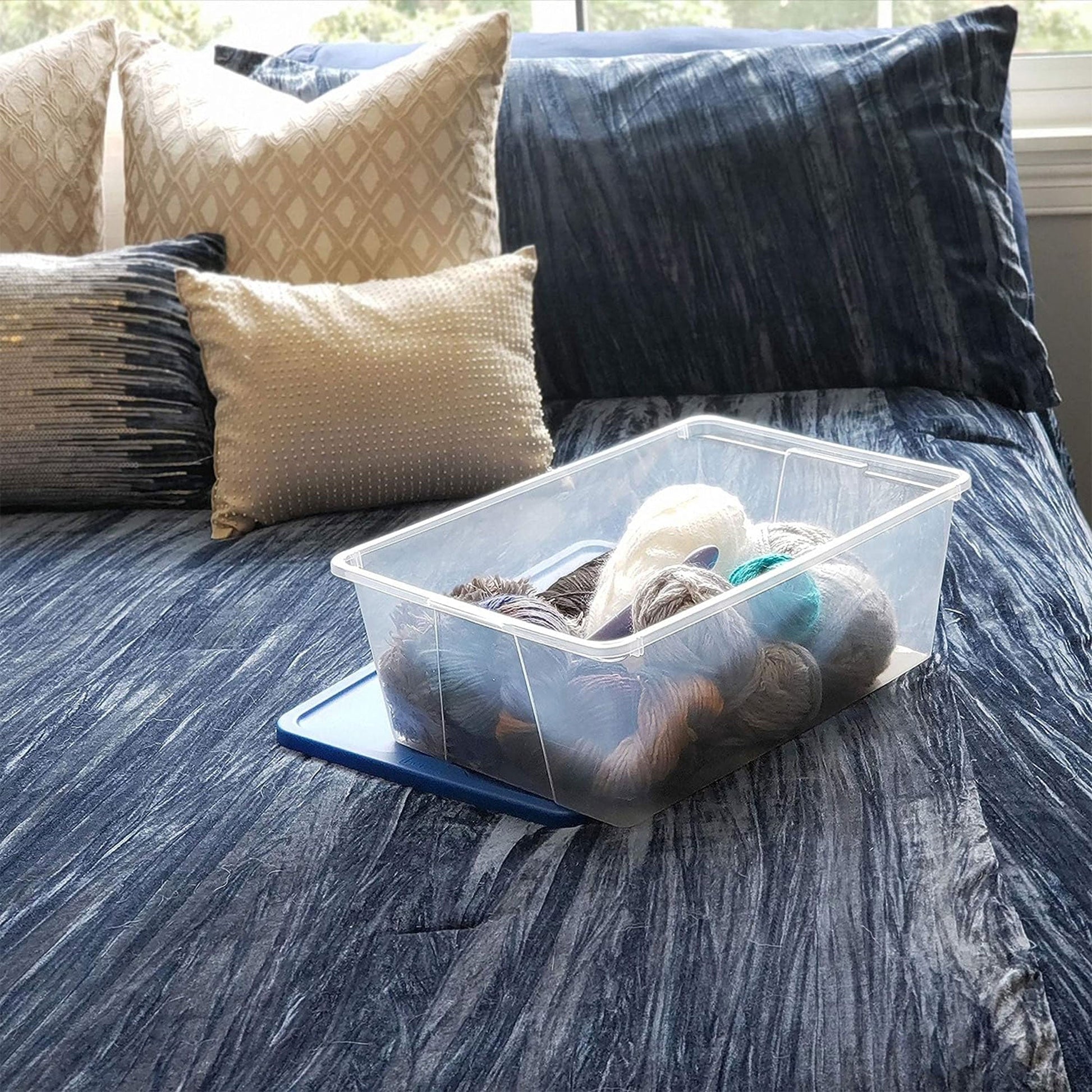 Profoundly indented lids and a modular design enable secure stacking, optimizing vertical storage capacity in your kitchen, bathroom, and closet. Bins fit snugly when stored away, promoting efficient organization. Ideal for bathroom, kitchen, garage, dorm, and off-season storage, these storage containers are designed for extended and enduring utility. Each bin is constructed of robust, high-strength plastic with dimensions of 11 inches long, 16.25 inches wide, and 5.62 inches tall. With the 5.62-inch height, the clear organizer box is great for under-bed storage, too!