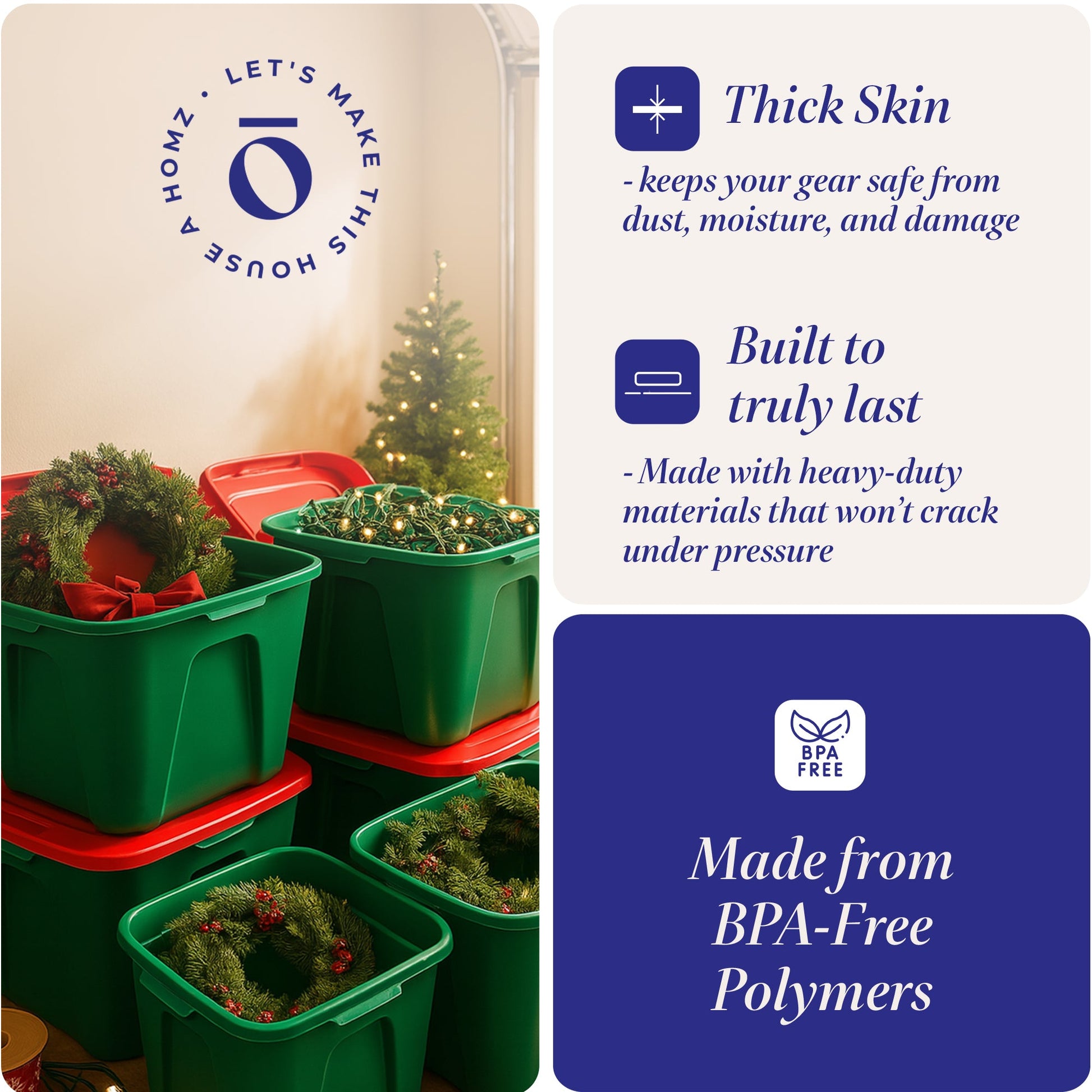 Whether you need to store your clothes, seasonal holiday decorations, gift wraps, personal items, or more, you can rely on the HOMZ 18-Gallon Heavy-Duty Plastic Holiday Storage Totes to keep your home neat and organized.